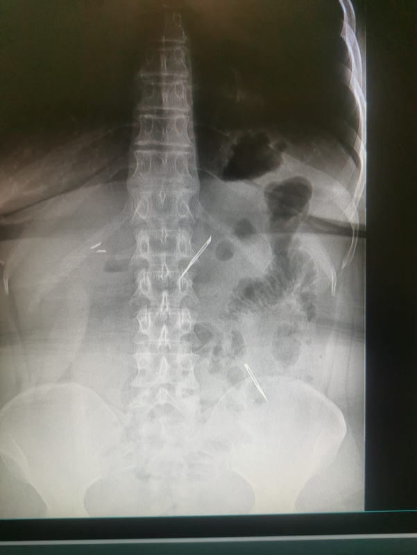 Sağlık Bilimleri Üniversitesi Ankara Atatürk Sanatoryum Eğitim ve Araştırma Hastanesi'ne mide ve karın bölgesinde aşırı ağrı şikayeti ile müracaat eden 46 yaşındaki D.E.'nin yapılan tahlil, tetkik ve çeşitli görüntülemelerden sonra bağırsak kısmında 2 adet neşter olduğu tespit edildi.
