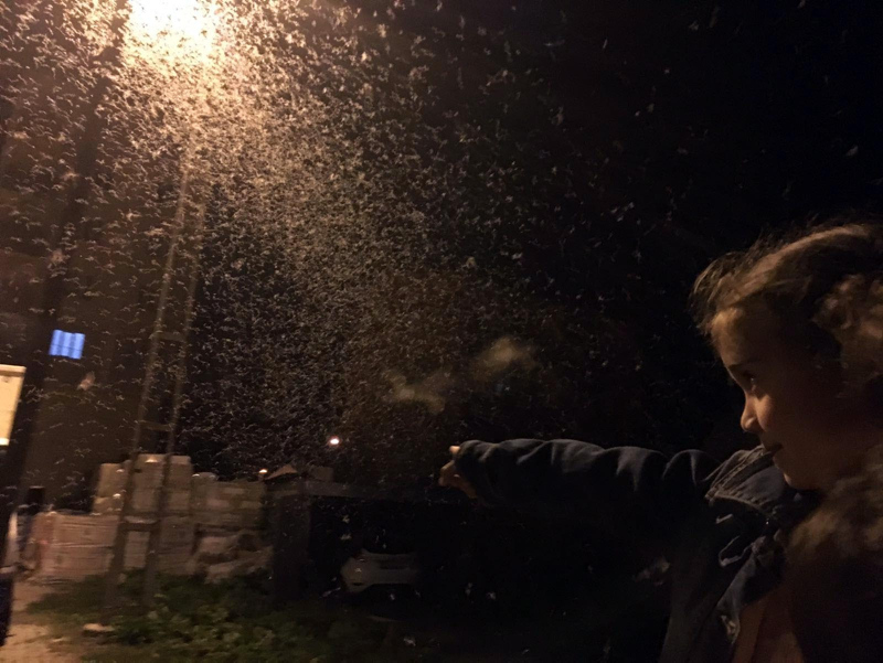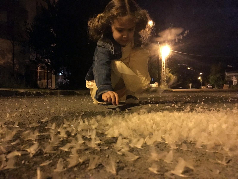 Halk dilinde 'Beyaz söğüt' kelebekleri olarak bilinen kelebekler, havanın kararması ile birlikte akın akın, Karagöl Mahallesi Sağlık Sokağı'na geldi.