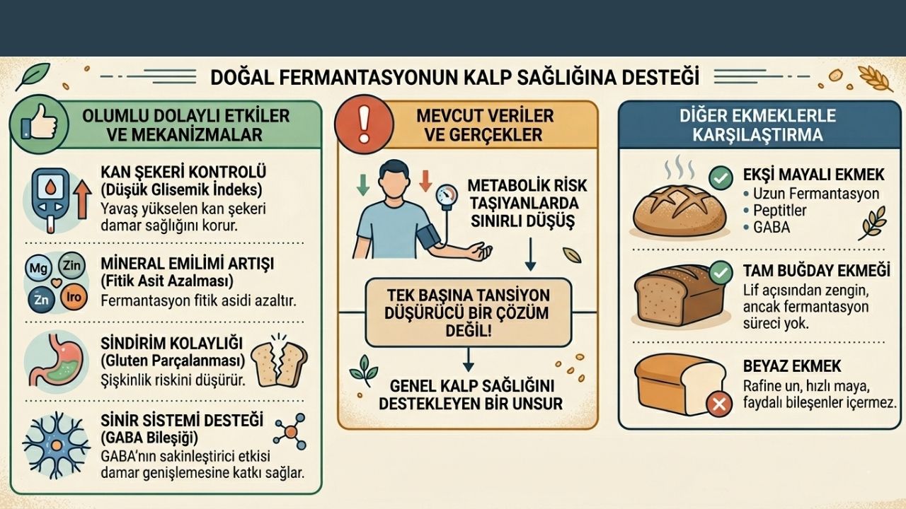 Ekşi mayalı ekmek, fermantasyon sürecinde oluşan peptitler ve GABA gibi bileşikler sayesinde damar yapısını etkileyerek kan basıncını sınırlı düzeyde düşürebiliyor. Bu etki özellikle metabolik risk taşıyan bireylerde gözleniyor. Ancak mevcut veriler, ekşi mayanın tek başına tansiyon düşürücü bir çözüm olmadığını, daha çok genel kalp sağlığını destekleyen bir beslenme unsuru olduğunu ortaya koyuyor.