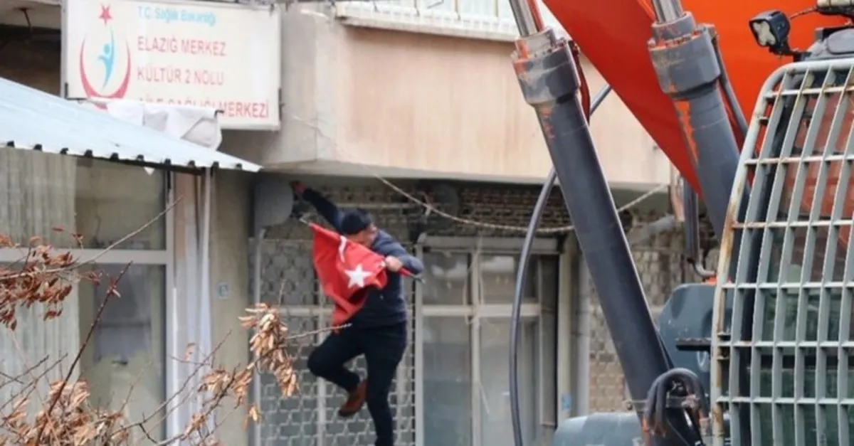 Elazığ'da yıkım kararı verilen binanın girişindeki kapıda kalan Türk bayrağını fark eden operatör Hıdır Demir, Türk bayrağını alarak gönülleri fethetti.