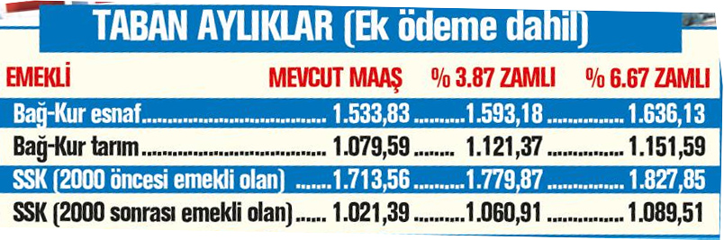 Bu tahmine göre, 2018'in ikinci yarısında enflasyon yani SSK ve Bağ- Kur emeklilerinin Ocak zammı yüzde 3.87 olacak. Maaşlarda 39,52 ile 189,32 lira arasında artış yaşanacak. En düşük aylık bin 21 lira 39 kuruştan bin 60 lira 91 kuruşa, en yüksek maaş da 4 bin 892 lira 19 kuruştan 5 bin 81 lira 51 kuruşa çıkacak. .