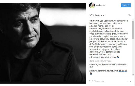 Erkal'ın fotoğrafını paylaşan Ün altına "Çok üzgünüm...O hem sevilen bir sanatçı, hem eş, hem baba, hem arkadaş, hemde çok iyi bir insandır. Sevgili arkadaşım İbrahim inşallah bu zor dakikaları atlatacak,az önce eşimle hastaneye gittik, eşinden ve yakınlarından beyin kanaması sonucu ameliyatta olduğunu öğrendik, ne kadar perişan olduklarını anlatmak mümkün değil.Allahım önce eşine ve çocuklarına, yeni doğmuş bebeğine sonra tüm sevenlerine bağışlasın.Acil şifalar diliyorum.En kısa zamanda güzel haberlerini almayı ümit ediyorum.Dualarımız seninle" notunu düştü..
