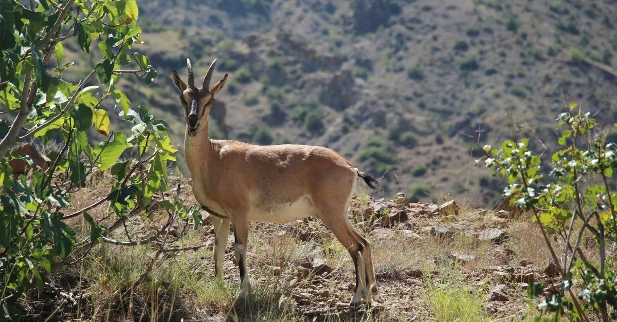 Erzurum'un Olur ilçesi Ormanağzı köyü Ağ Gedik mevkiinde yaban keçisi yol kenarındaki inciri yerken görüntülendi.