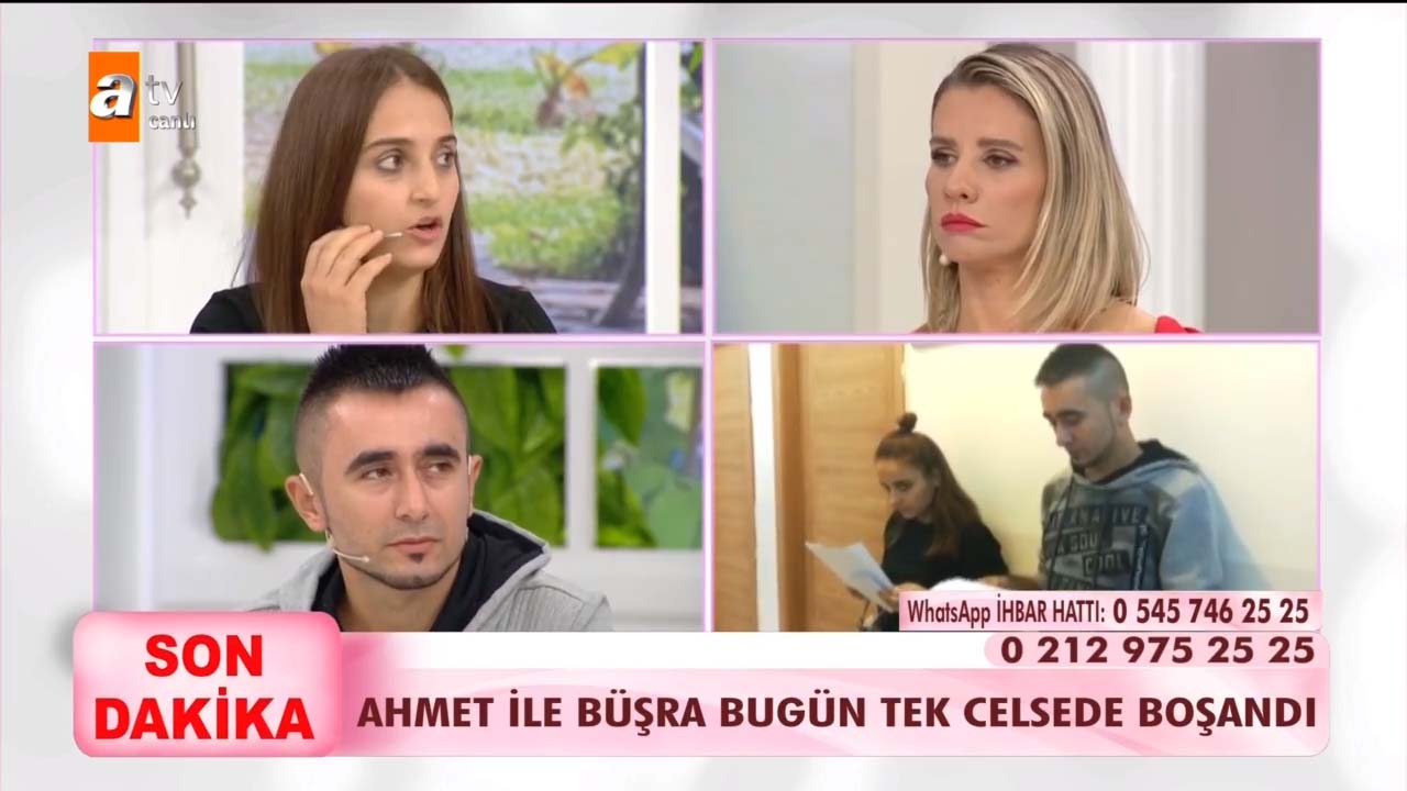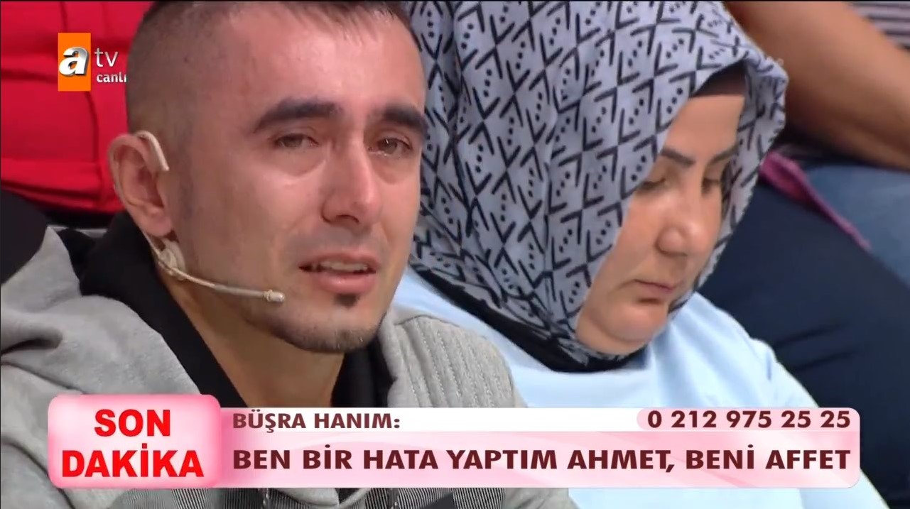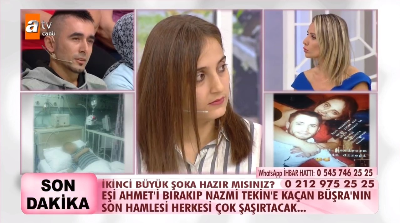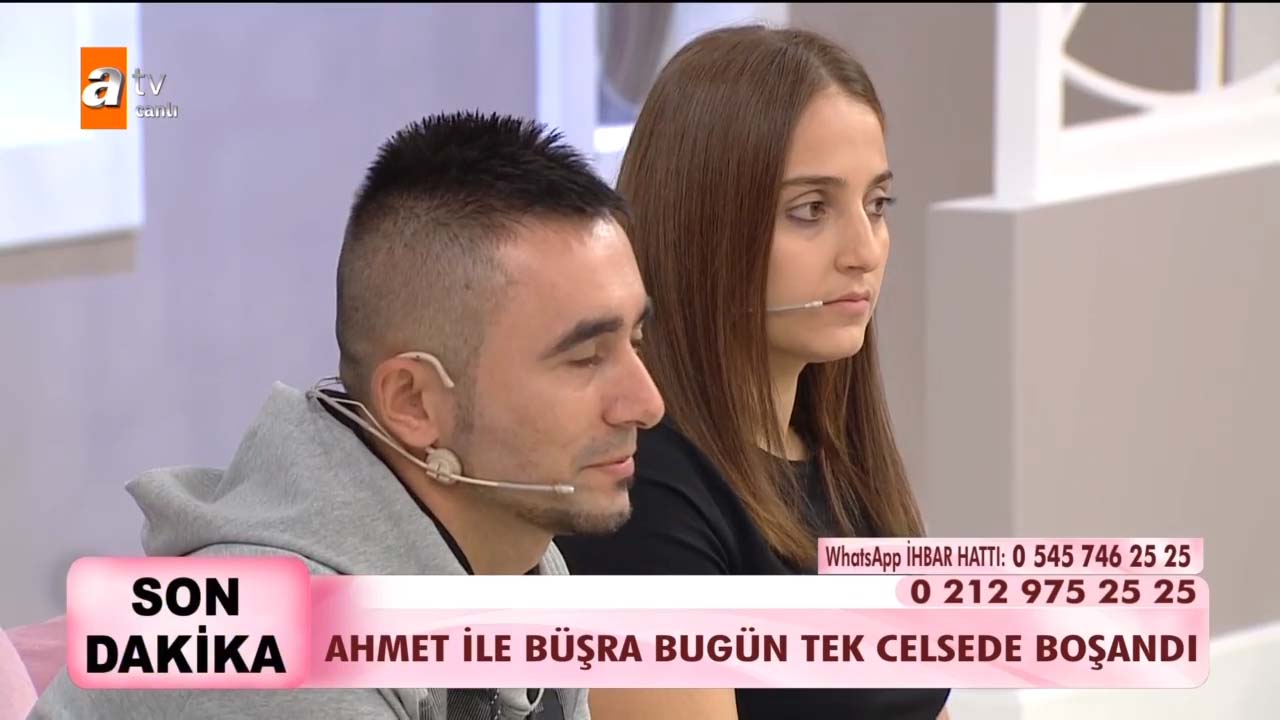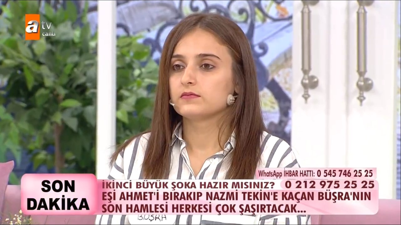 9 ay önce eşini ve biri hasta iki çocuğunu bırakıp Nazmi Tekin'e kaçan Büşra, canlı yayında eşi Ahmet ile ilk kez karşı karşıya gelmişti.