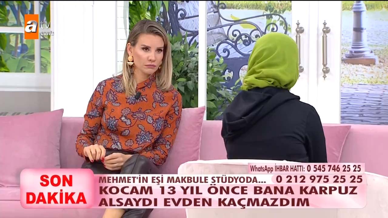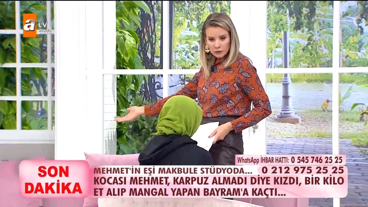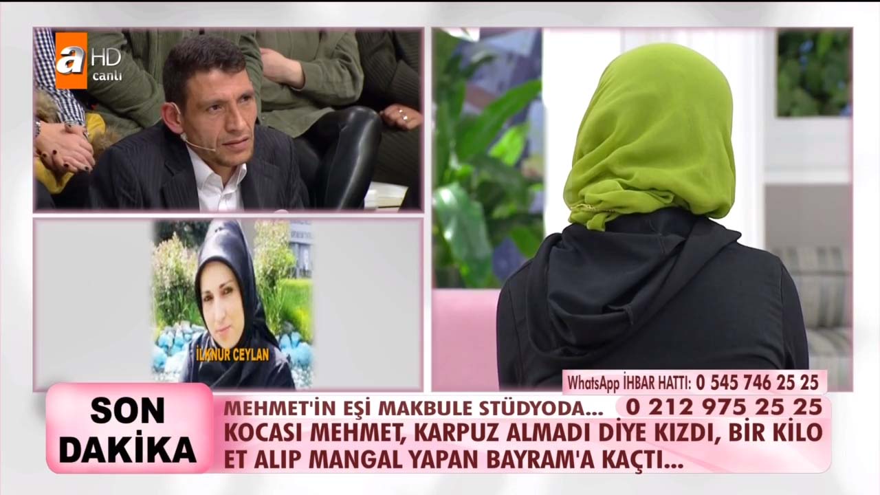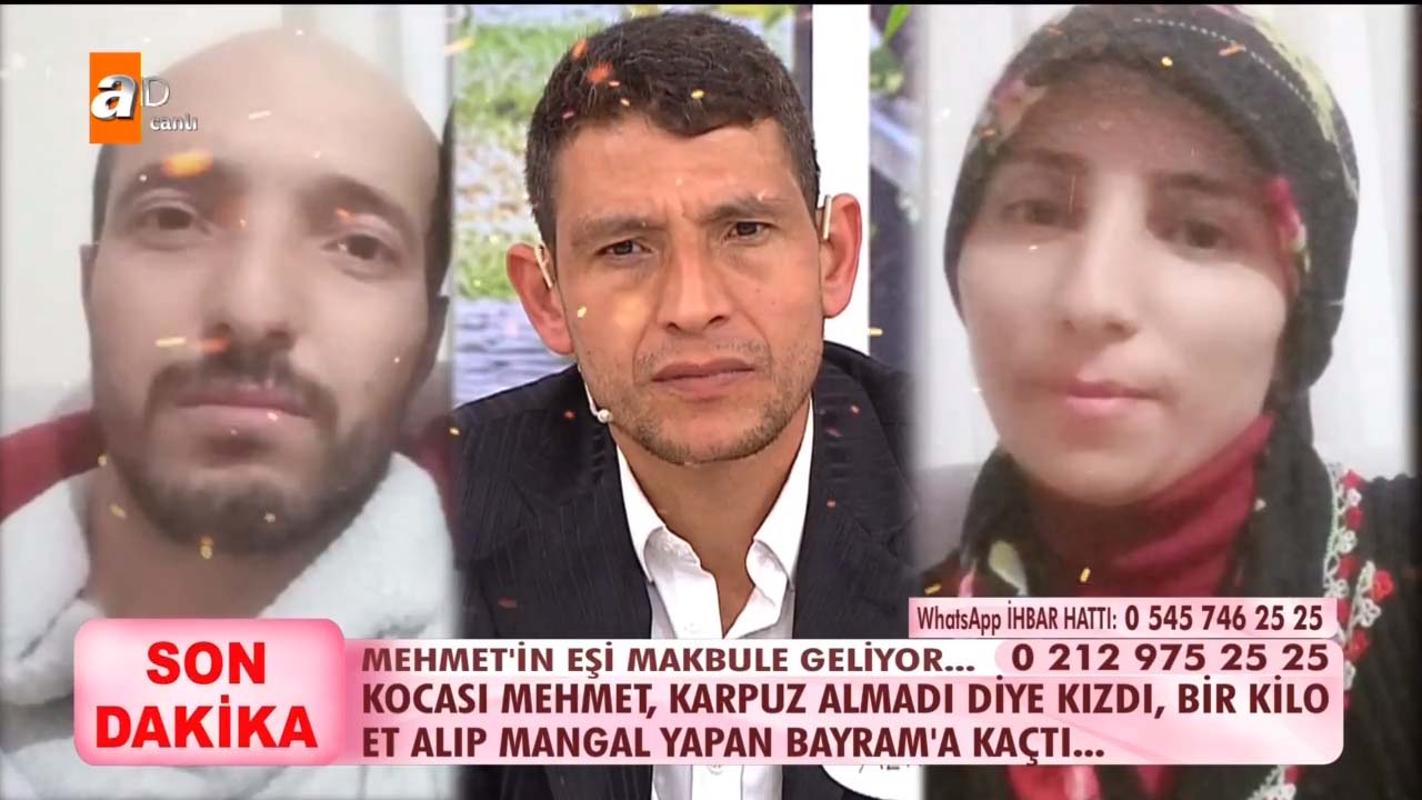Esra Erol'da canlı yayınında akılalmaz kaçış öyküsü! 15 yıllık eşi Makbule Tunçbilek'i bulmak için Esra Erol'da programına katılan Mehmet Tunçbilek, eşinin bir kilo et karşılığında akrabasına kaçtığını iddia etti. Eşi Makbula Tunçbilek ise skandal açıklamalarda bulunarak, "Kocam 13 yıl önce ben hamileyken bana karpuz almadı. Alsaydı ben evden kaçmazdım." ifadelerini kullandı. Esra Erol'da programına katılan Mehmet Tunçbilek, yıllar sonra eşi Makbule Tunçbilek ile canlı yayında yüzleşti.