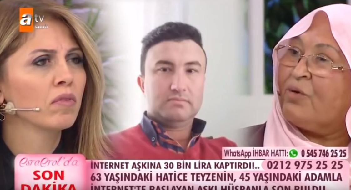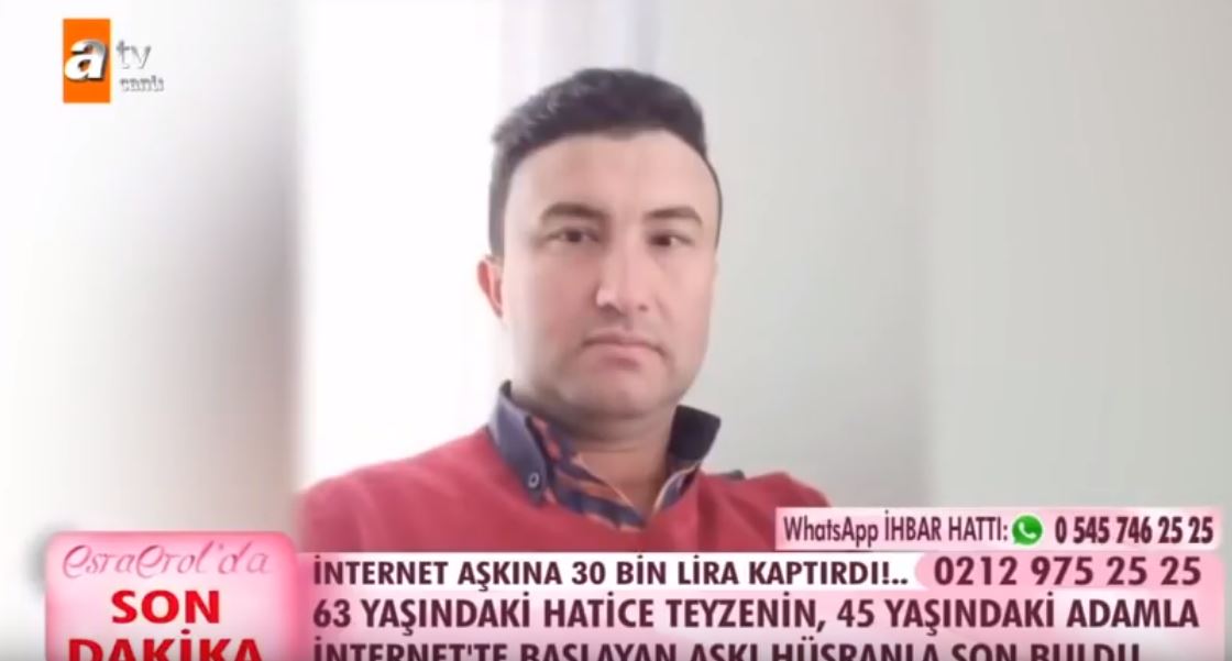 63 yaşındaki Hatice Kılıç, internetten tanıştığı 45 yaşındaki adama önce aşık oldu, sonra 30 bin lira kaptırdı. Esra Erol'da programında başına gelenleri anlatan Hatice Kılıç'ın elindeki fotoğraftan, dolandırıcının bir belediye çalışanı olduğu ortaya çıktı.