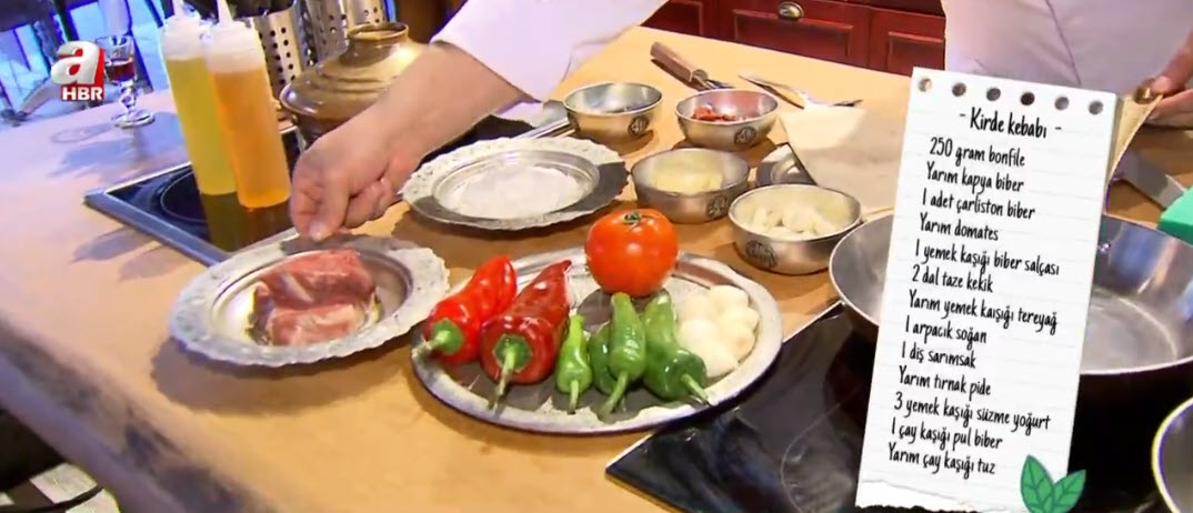 Malzemeler: 250 gram bonfile (Kuzu eti de kullanılabilir), yarım kapya biber, 1 adet çarliston biber, yarım domates, 1 yemek kaşığı biber salçası, 2 dal taze kekik, yarım yemek kaşığı tereyağ, 1 arpacık soğan, 1 diş sarımsak, yarım tırnak pide, 3 yemek kaşığı süzme yoğurt, 1 çay kaşığı pul biber, yarım çay kaşığı tuz, süzme yoğurt, lavaş ekmeği.