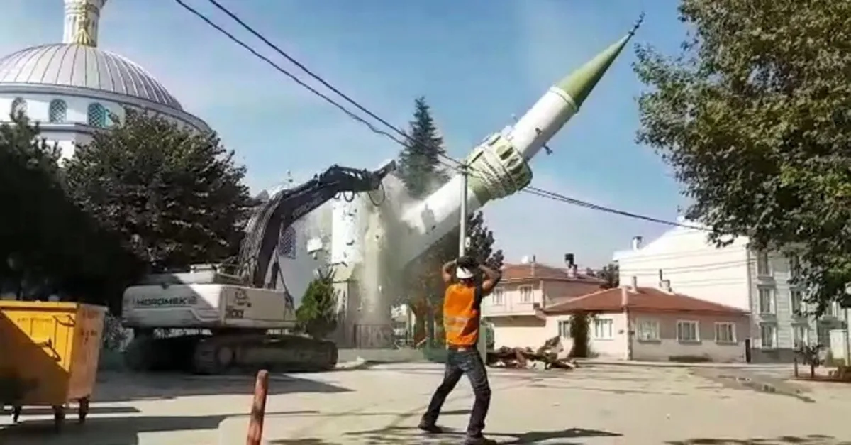 Köy meydanına yakın yerdeki depreme dayanıksız minare için belediye ekipleri seferber oldu.