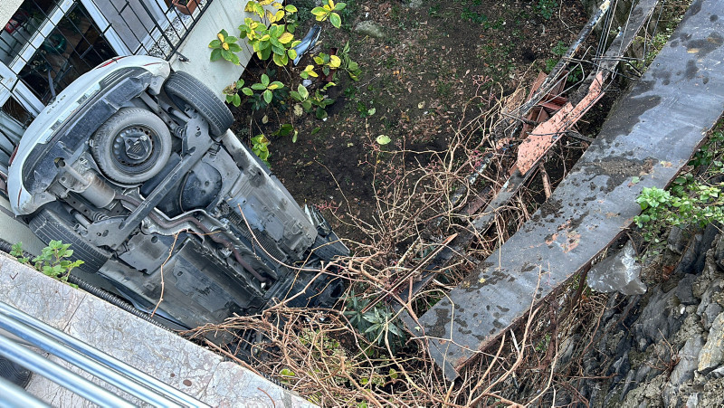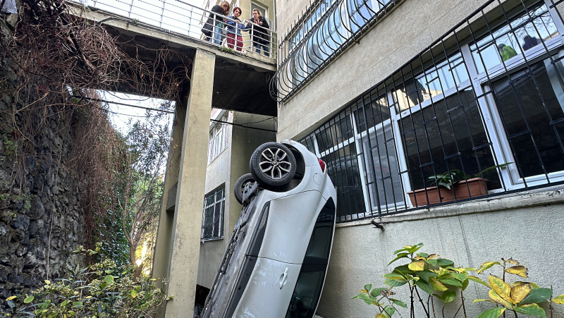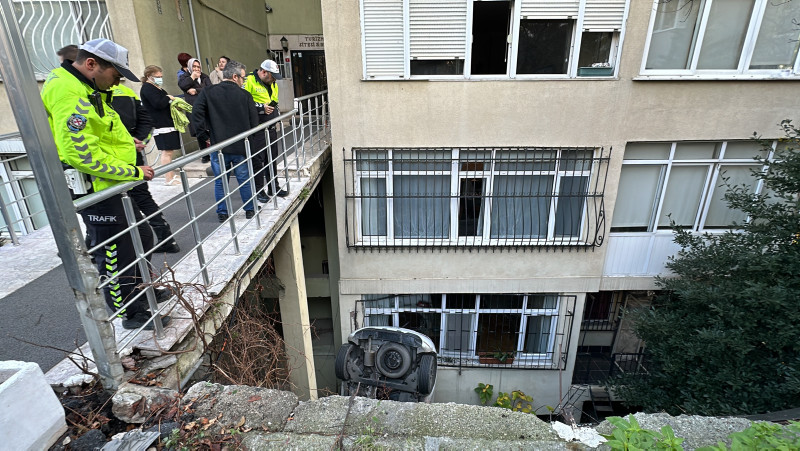 Kontrolden çıkan araç yokuşun sonundaki korkulukları kırdıktan sonra yaklaşık 8 metreden aşağıya uçmuştu. O esnada zemin kattaki bir dairenin demirliklerine çarparak penceresini kıran araç, aşağıya düşerek durabilmişti.