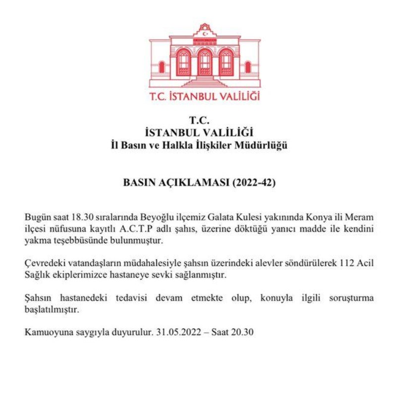 Galata Kulesi Meydanı'nda eline plastik orak alan bir şahıs tinerle kendini alev alev yaktı. Gencin ateş topuna döndüğü o feci anlar etraftaki vatandaşların cep telefonu kamerasına saniye saniye yansıdı. Vatandaşların yangın söndürme tüpü ile müdahale ettiği genç ağır yaralı halde hastaneye kaldırıldı. İstanbul Valiliğinden olaya ilişkin yapılan açıklamada "Şahsın hastanedeki tedavisi devam etmekte olup, konuyla ilgili soruşturma başlatılmıştır." denildi.