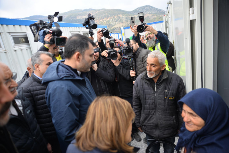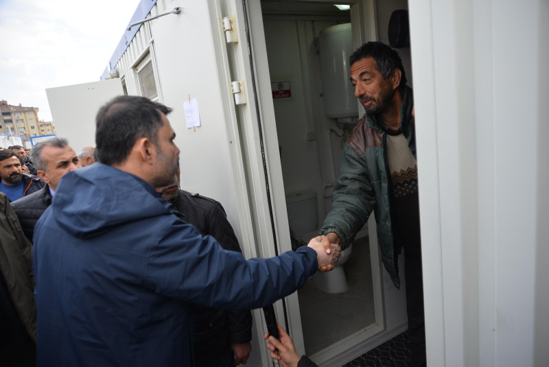 Kalıcı konutlar inşa edilene kadar bir süre kalacakları yeni yuvalarına yerleşen depremzedelerin sorunlarını da dinleyen Bakan Kurum, "Büyük bir afet yaşadık. Evlerimiz yerle bir oldu. İnsanlarımızı kaybettik. Bu konteynerler eski yaşamınız gibi olmasa da yeni yuvalarınız inşa edilene kadar sizleri soğuktan, yağmurdan ve sıcaktan koruyacaktır. Vatandaşlarımız normal hayatlarına dönene, sıcak yuvalarına kavuşana kadar burada, sahada olacağız. Buradan elimizi çekmeyeceğiz. Tüm sorunlarınız arkadaşlarımız tarafından tespit edilip derhal çözülecektir. Bu süreci hep birlikte devlet-millet el ele vererek atlatacak, depremin yaralarını saracağız" dedi.