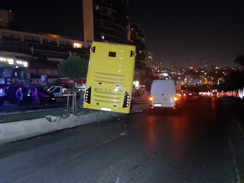 Kaza sonrası sürücü ve otobüste bulunan 2 yolcu şans eseri yara almazken, çarpmanın etkisi ile otobüs beton bariyerin üstünde asılı kaldı.