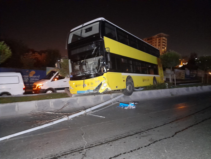 Son dakika haberine göre: Başakşehir'de zeminin ıslak olmasından dolayı sürücüsünün direksiyon hakimiyetini kaybettiği çift katlı otobüs beton bariyerlere çarpıp askıda kaldı. O esnada otobüs içinde bulunan iki kişinin de kazayı yaralanmadan atlattığı öğrenildi.