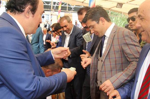 Birçok yerel sanatçının okuduğu Kürtçe türküler eşliğinde uzun halayların çekildiği düğünde aşiret lideri Ertuş, davetlilere dolar taktı.