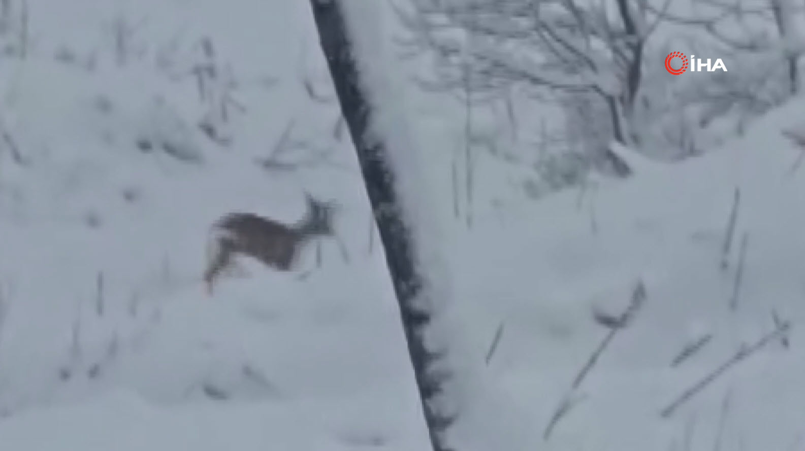 Kar yağışının ardından ormanlık alanlardan ilçe merkezine yakın mahallerde görülen yabani hayvanlar, cep telefonu kameraları tarafından saniye saniye kaydedildi.
