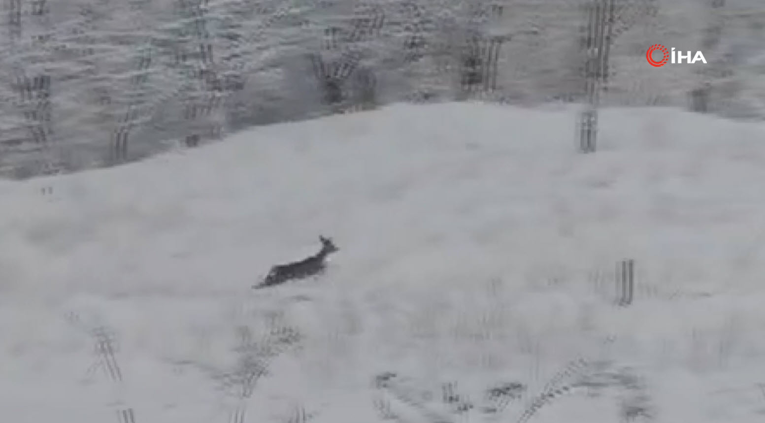 Dün gece saatlerinden itibaren başlayan yağışın ardından karla kaplı arazide dolaşan bir vaşak ve karaca görüntülendi.
