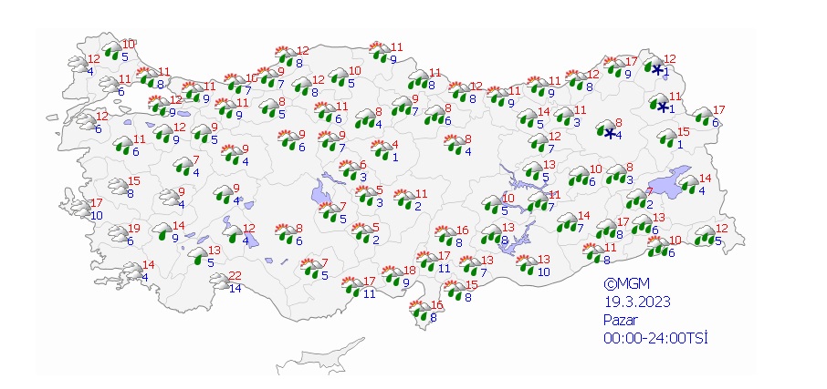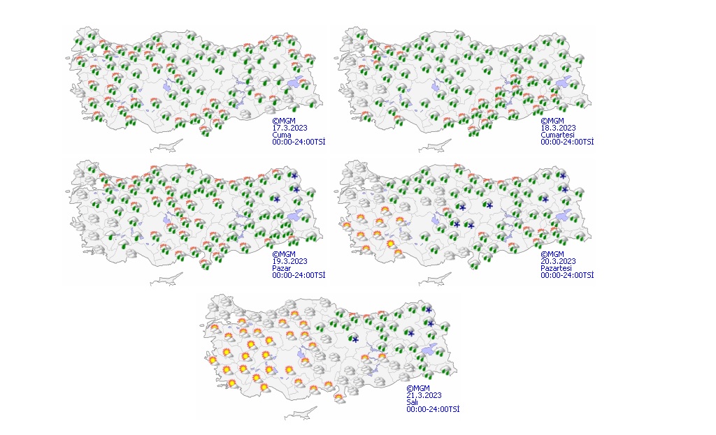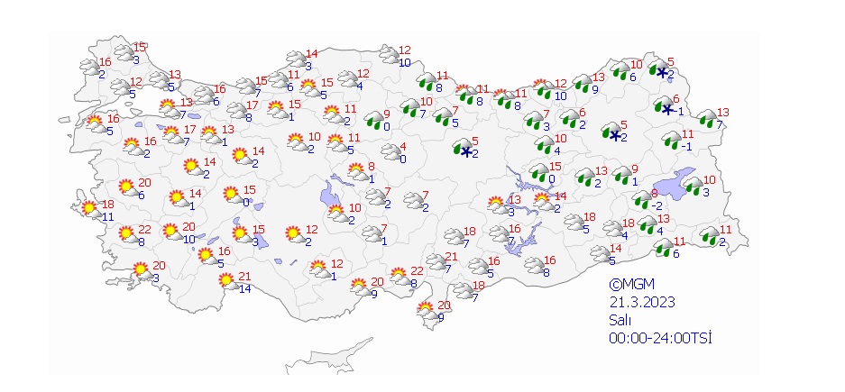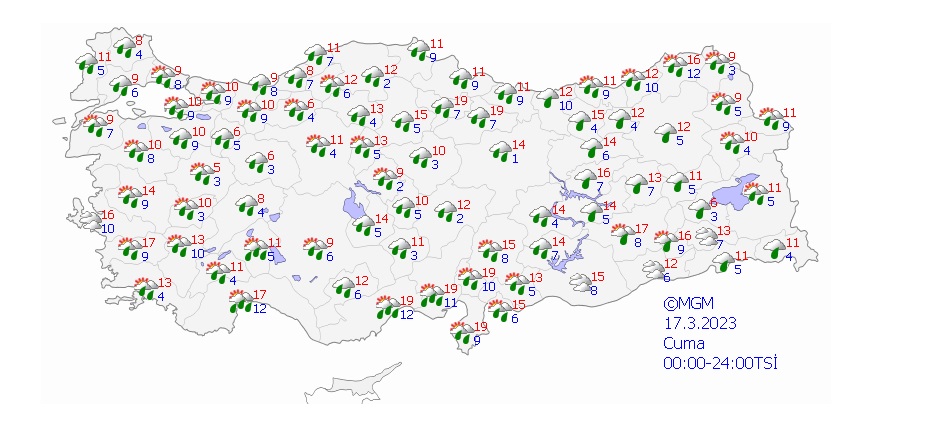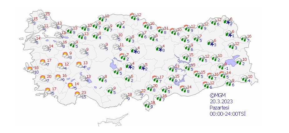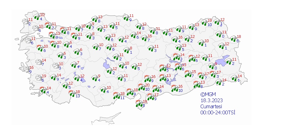 Meteoroloji Genel Müdürlüğü'nün son hava durumu raporuna göre Antalya, Isparta, Mersin ve Adana çevrelerinde kuvvetli sağanak yağış görülecek. Doğu bölgelerindeki illerde akşam saatlerinde sıcaklığın sıfırın altına düşeceği gözlemlendi. Yapılan açıklamada yağış nedeniyle oluşabilecek sel riskine karşı vatandaşların tedbirli olmaları istendi. Öte yandan Marmara'nın batısı ile Kıyı Ege'de kuzey ve kuzeydoğu, Doğu Akdeniz'in iç kesimlerinde kuvvetli fırtına bekleniyor.