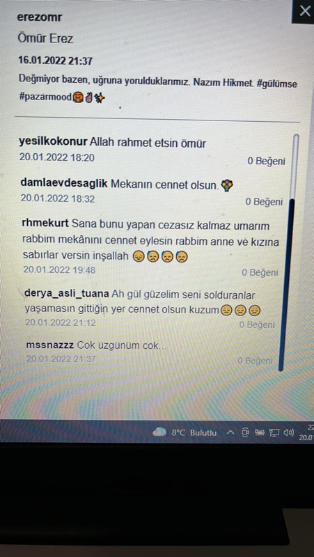 İstanbul Kartal'da aile sağlığı merkezinde hemşire Ömür Erez'i su içtiği sırada tabancayla vurarak öldüren Rahmi Uygun ve yakalanan arkadaşının emniyetteki işlemleri devam ederken, hemşire Ömür Erez'in öldürülmeden dakikalar önce yaptığı sosyal medya paylaşımı yürekleri dağladı. Öte yandan annesi ile aynı kaderi paylaştığı ortaya çıktı. Hemşirenin dayısı ise "Erez küçük yaşta babasını kaybetmişti. Elimizde büyüttük kızcağızı. Şimdi de 10 yaşında öksüz kalan kızı bize emanet" diye konuştu.