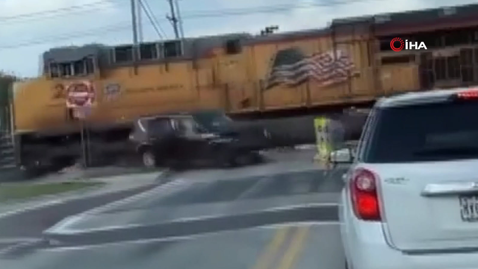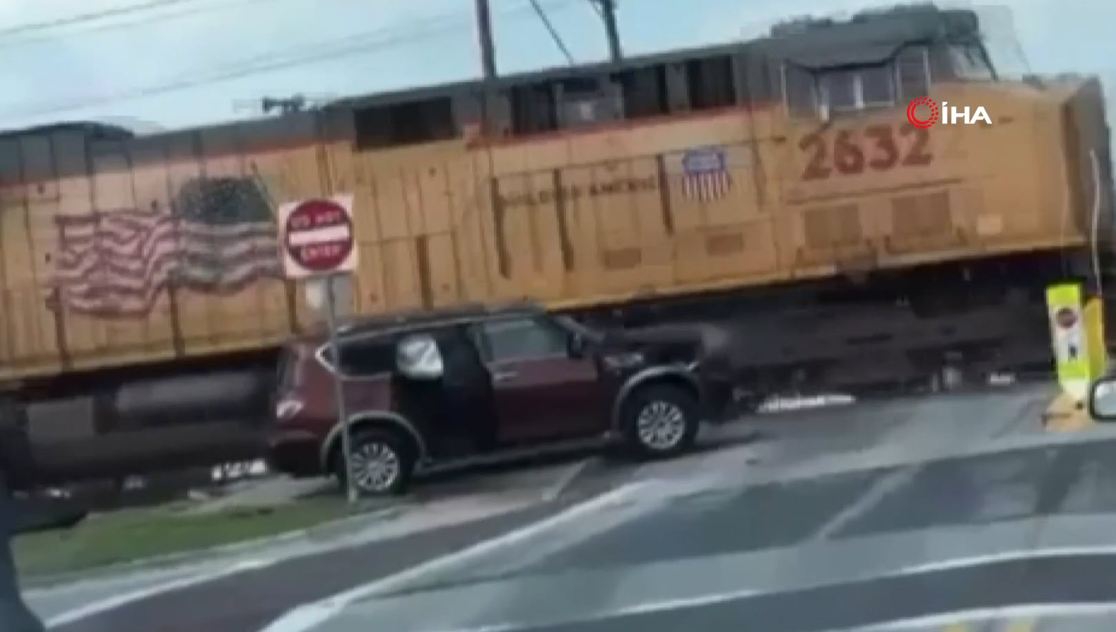 ABD'nin Dallas kentinde hızla gelen yük treni, hemzemin geçitteki raylarda bekleyen aracı biçti. Araçtaki 3 kişinin kazadan saniyeler önce kendilerini dışarı atmasıyla facianın eşiğinden dönüldü. İşte o anlar...