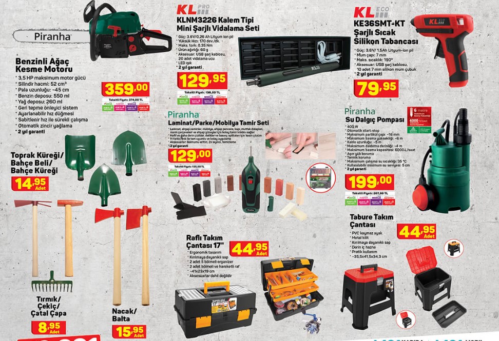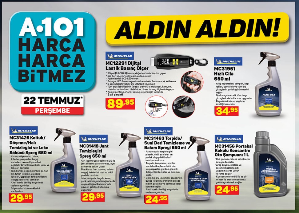 Televizyondan cep telefonuna, tabletten akıllı saate, turbo fırından buzdolabına birçok ürünün yer aldığı A101 22 Temmuz 2021 aktüel ürünler kataloğu yayımlandı. Bu hafta A101 müşterilerini yakından ilgilendiren sürpriz ürünler bulunuyor. Otomobil sahipleri için lastik basınç ölçer, hızlı cila, koltuk/dçşeme/halı temizleyici ve leke sökücü sprey, jant temizleyici sprey, torpido/suni deri temizleme ve bakım spreyi, portakal kokulu konsantre oto şampuan gibi çeşit çeşit ürünlerin de yer aldığı 22 Temmuz 2021 A101 aktüel ürünler kataloğuna ahaber.com.tr'den ulaşabilirsiniz.
