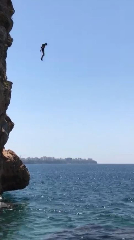 Antalya'da adrenalin tutkunu gençlerin 40 metre yüksekliğindeki falezlerden denize yaptıkları tehlikeli atlayışlar korkutuyor. Falezlerin ucundan kendini boşluğa bırakan bir genç suya düştükten sonra bir süre hareketsiz kalınca paniğe sebep oldu, 10 saniye sonra kendine gelen genç yüzerek kıyıya çıktı.