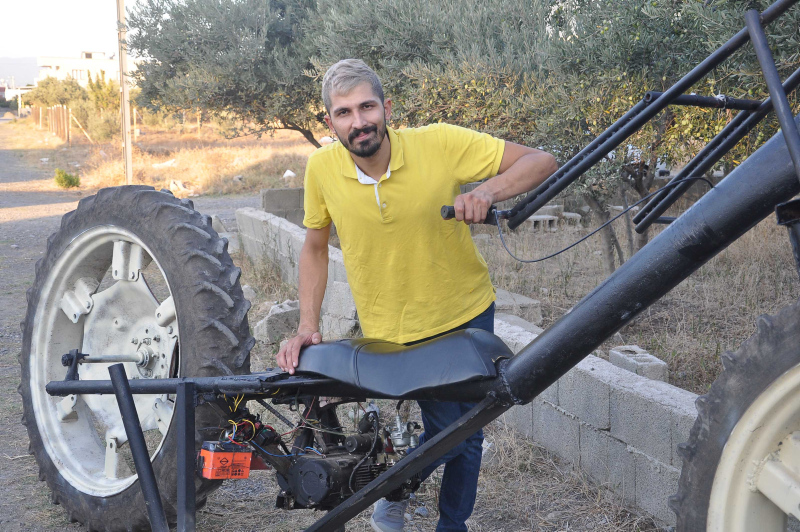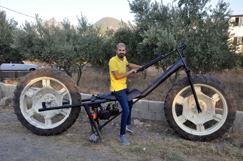 Osmaniye'de sosyal medya fenomeni Sefa Kındır, traktör tekerleri ile 2 metre yüksekliğinde, 4,5 metre uzunluğunda 'traktörsiklet' adını verdiği motosiklet tasarladı.