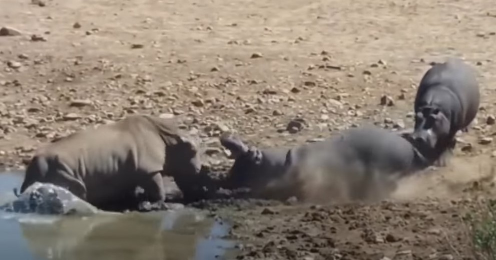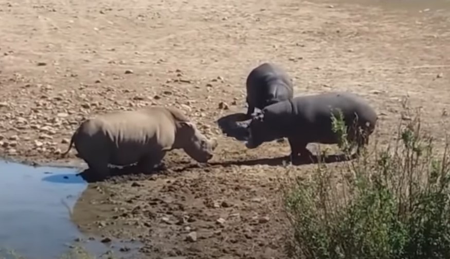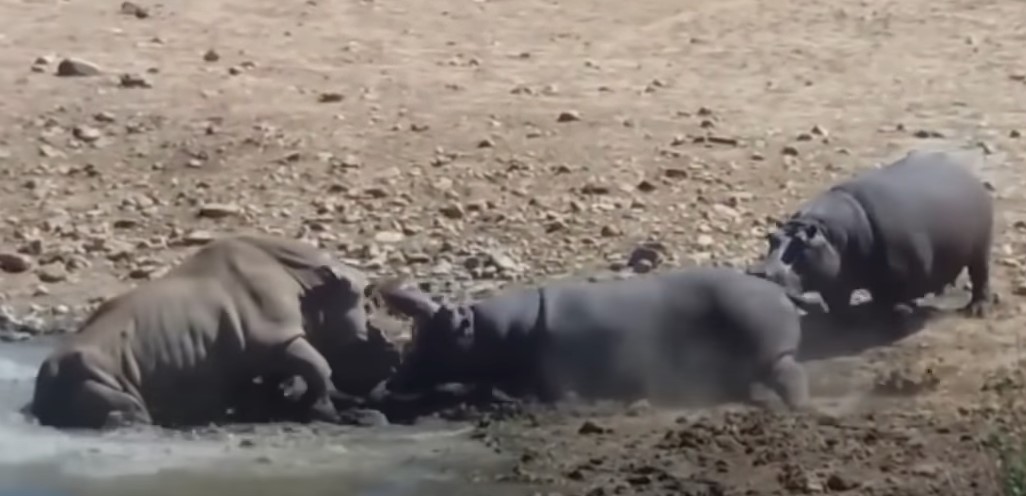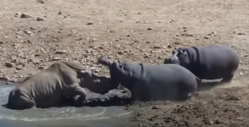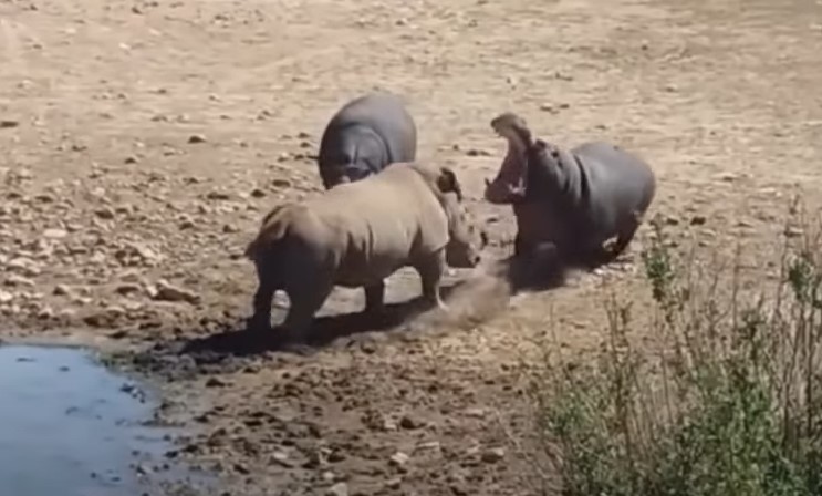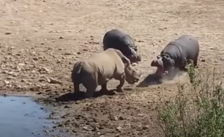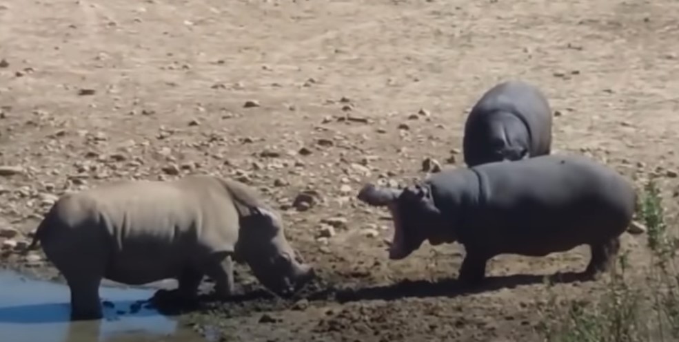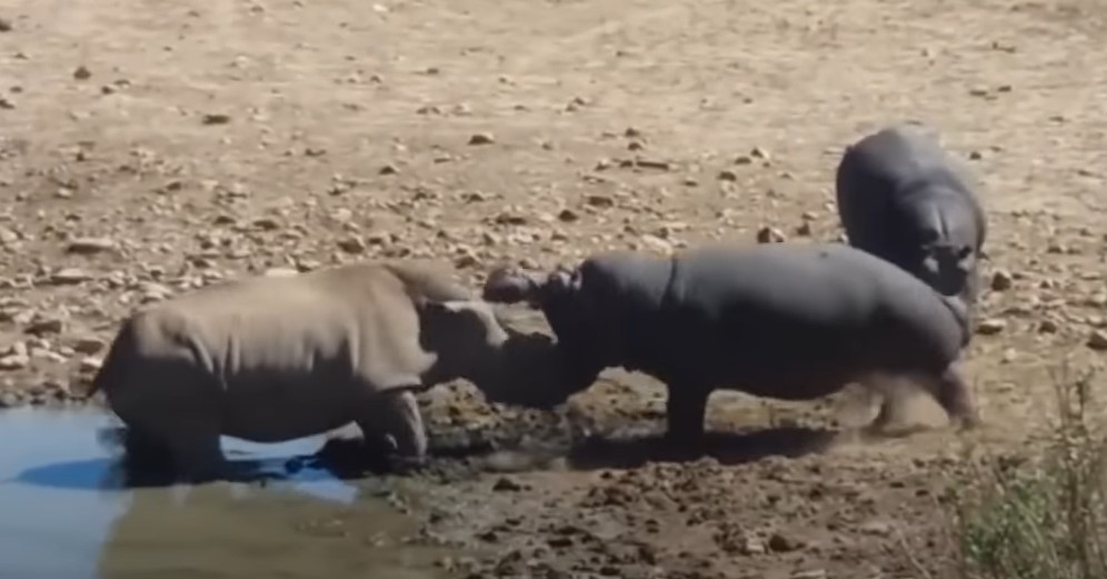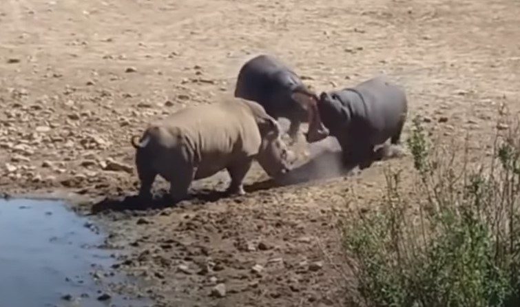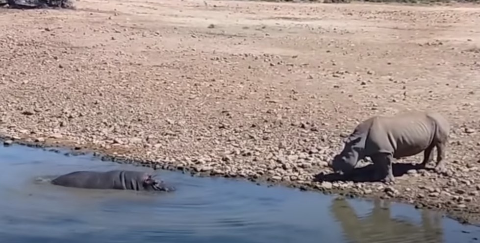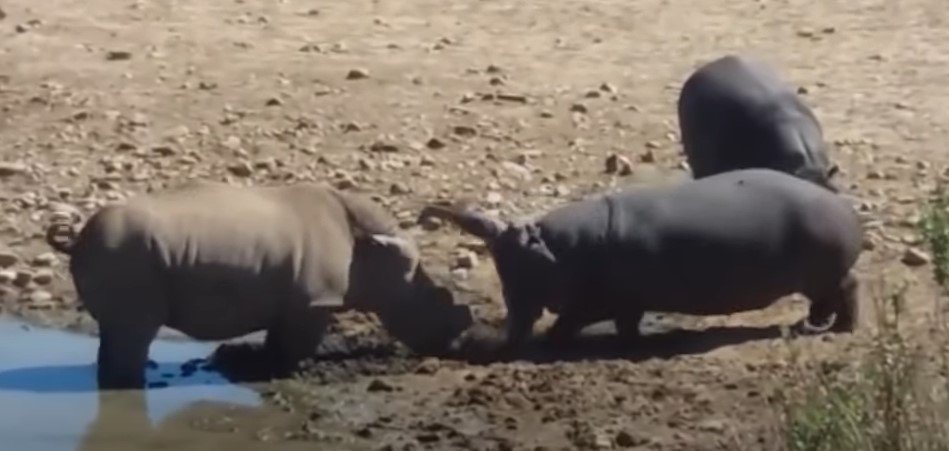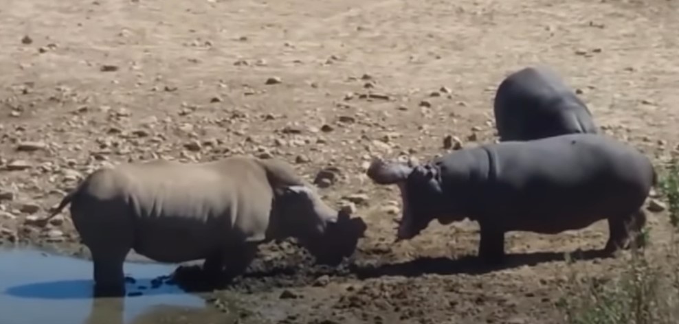 Su aygırı ilk önce tehdit gördüğü gergedanı bölgeden uzaklaştırmak için mücadele sergiledi. Ancak gergedan bölgeden uzaklaşmadı.