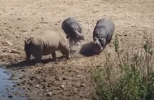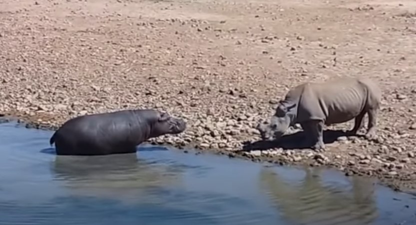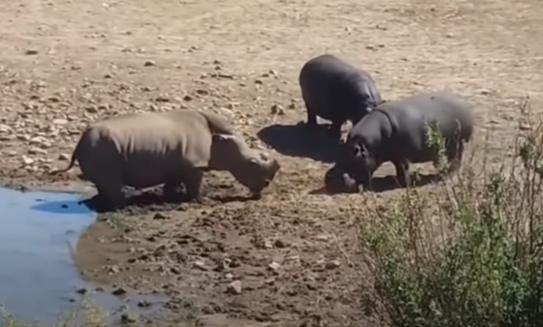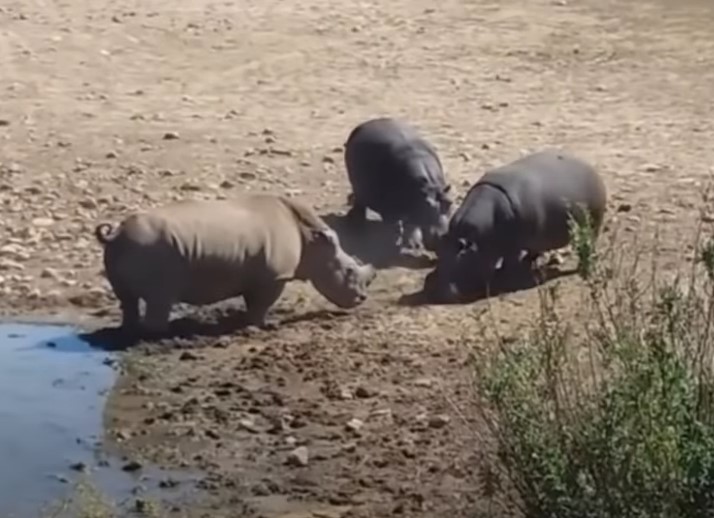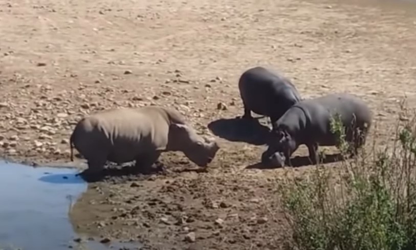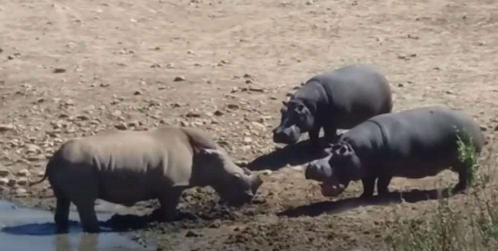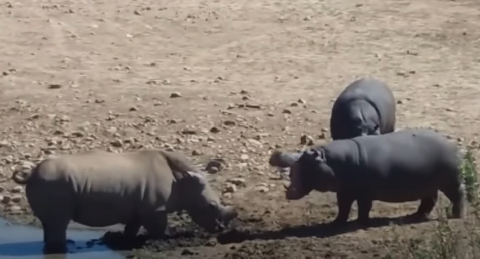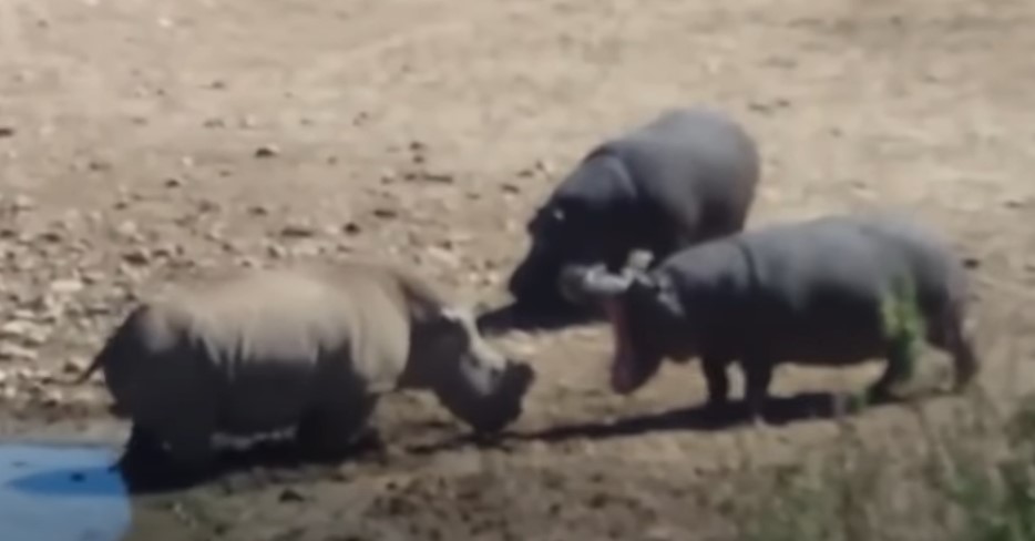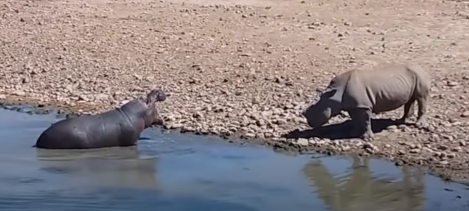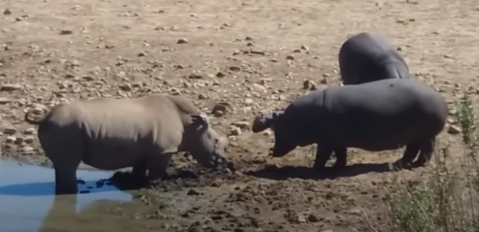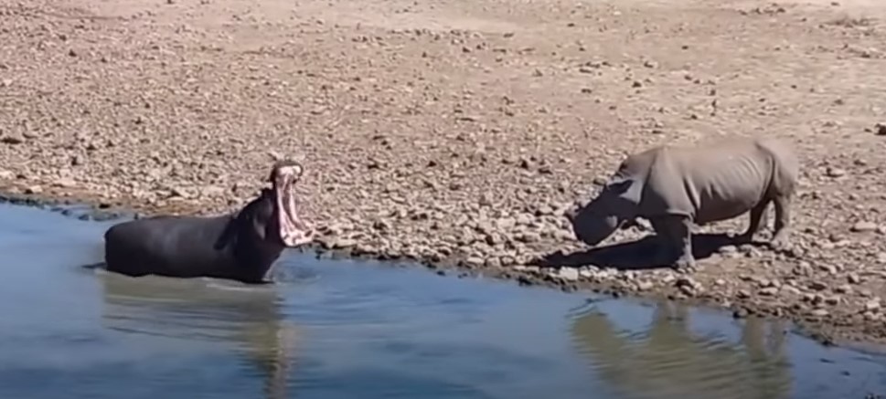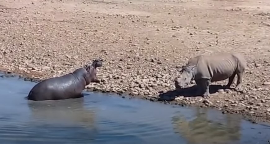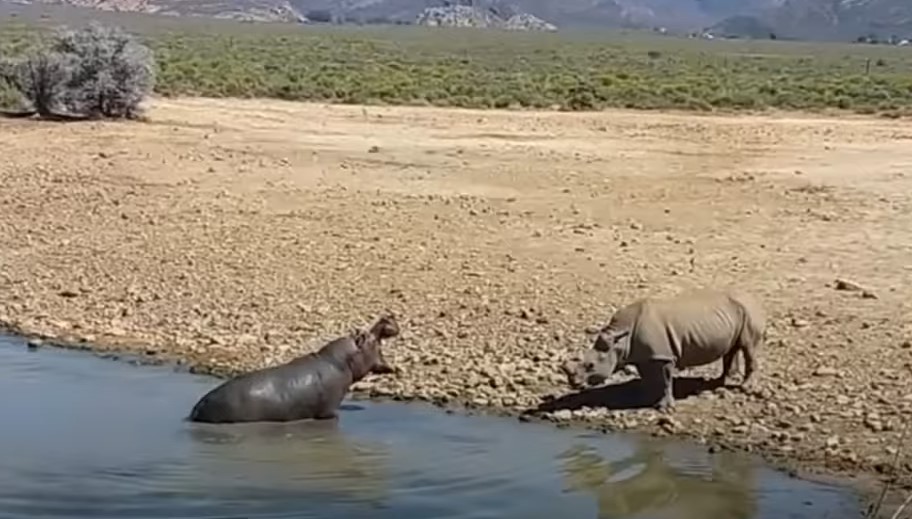 Su aygırı ilk önce tehdit gördüğü gergedanı bölgeden uzaklaştırmak için mücadele sergiledi. Ancak gergedan bölgeden uzaklaşmadı.