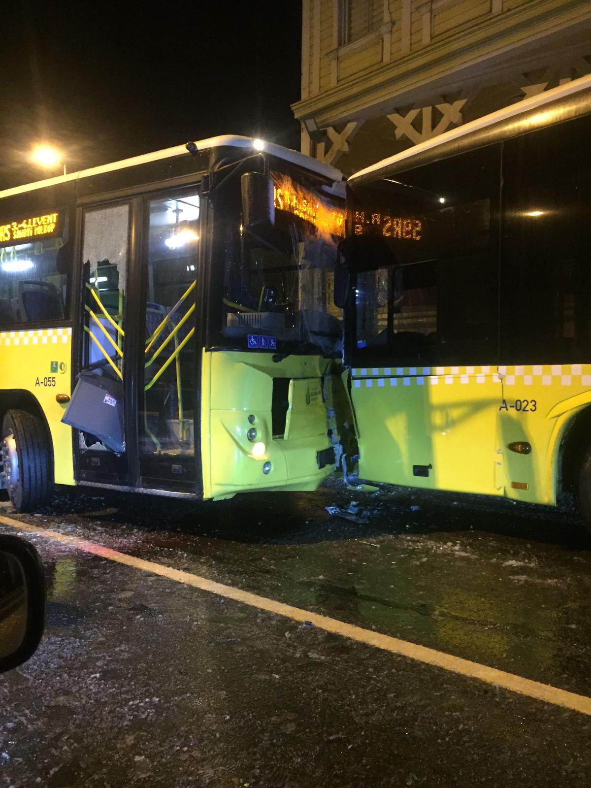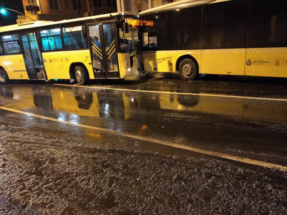 İstanbul Sarıyer'de kar yağışı ve buzlanma nedeniyle İETT'ye ait iki otobüs kafa kafaya çarpıştı. Kazada 4 kişi hafif yaralanırken kaza anı güvenlik kamerasına yansıdı. İşte o anlar...