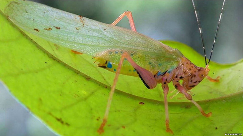 Çalı çekirgesi. Uluslararası Doğal Çevrenin Korunması örgütüne bağlı bir grup bilim insanı bu renkli yeni çekirge türünü güneybatı Surinam ormanlarında keşfetti.