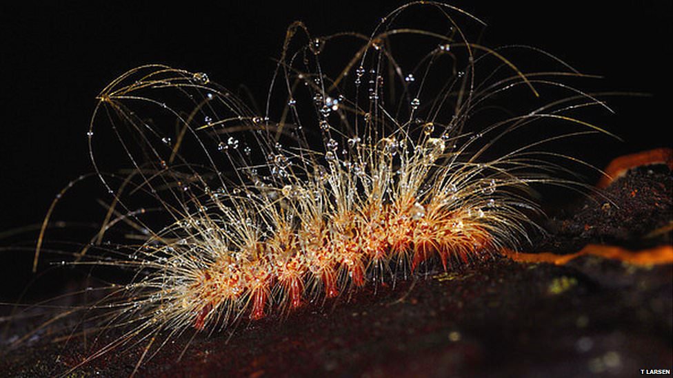Üzerine sabah çiği düşmüş güve tırtılı. Ormandaki ağaç gövdelerinde yetişen yosunlar üzerinde bulundu. Araştırmacılar civar köylerdeki insanları çevre koruması konusunda eğiterek ekoturizmden gelir edinmelerini sağlamaya çalışıyor.