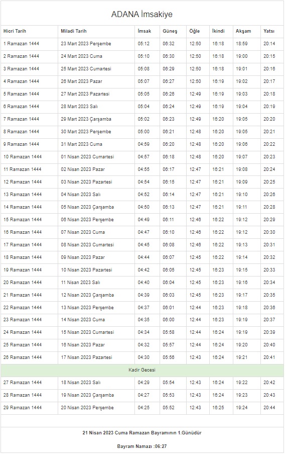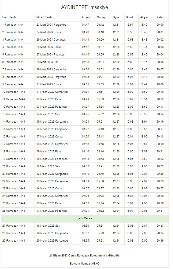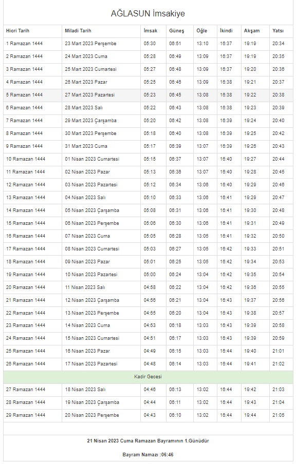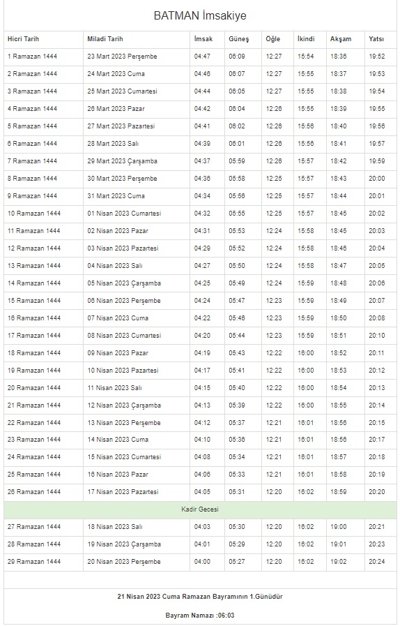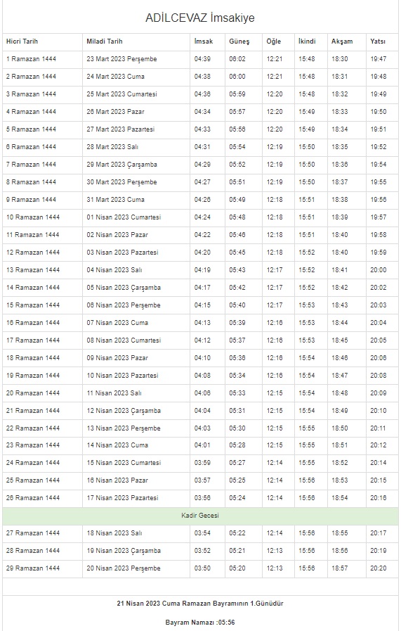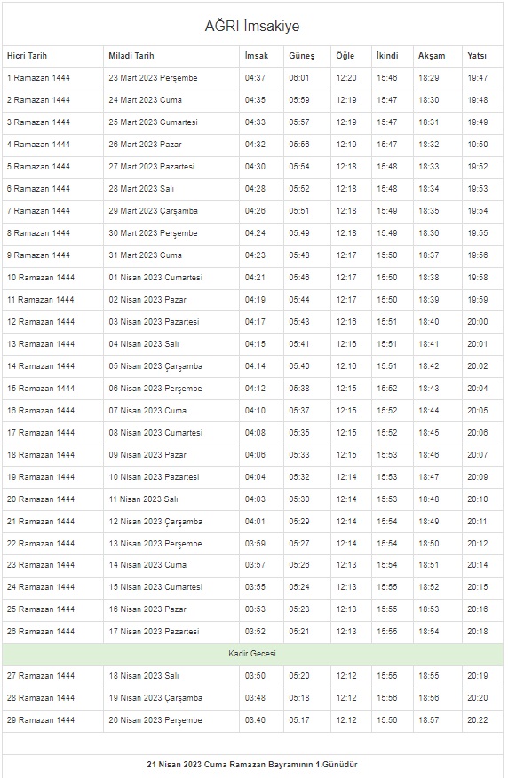 On bir ayın sultanı Ramazan hayatlarımızı, evlerimizi ve sofralarımızı bereketlendirmeye geliyor. Ramazan, müminler için rahmet ve mağfiret mevsimidir. Hidayet rehberi olan Kur'an-ı Kerim'in indirildiği aydır aynı zamanda. Ramazan ayında oruç tutmak, İslam dininin esaslarından ve Müslümanların yerine getirmekle yükümlü oldukları beş ibadetten biridir. Müminler ilk sahur ve iftarın öncesinde bulundukları şehirlerin vakitlerini öğrenmeye çalışıyor. İşte 2023 Ramazan imsakiyesi...