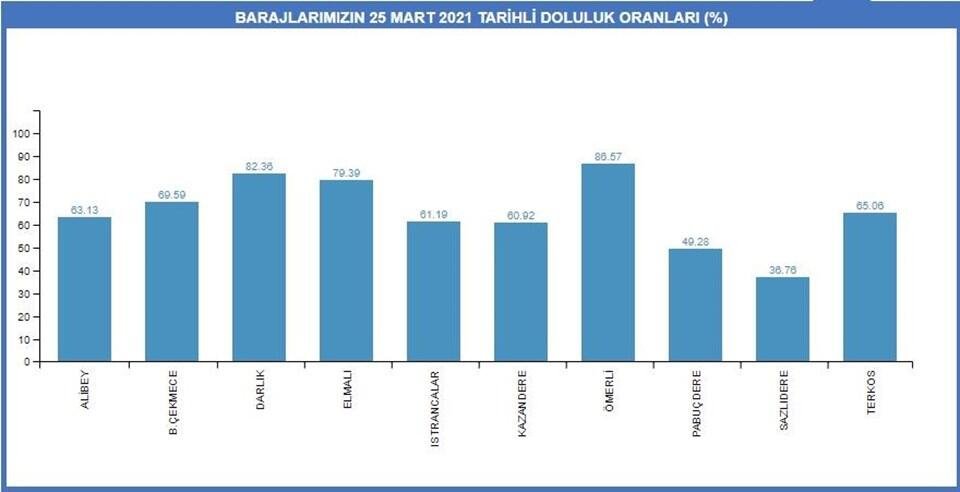 Su miktarı Istrancalar'da yüzde 61,19, Terkos'ta yüzde 65,06, Sazlıdere'de yüzde 36,76, Alibey'de yüzde 63,13, Büyükçekmece'de yüzde 69,59, Ömerli'de yüzde 86,57, Darlık'ta yüzde 82,36, Elmalı'da yüzde 79,39, Kazandere'de yüzde 60,92 ve Pabuçdere'de yüzde 49,28 olarak kaydedildi.
