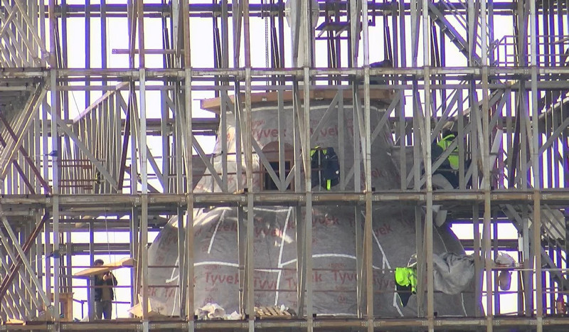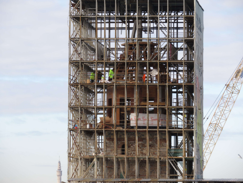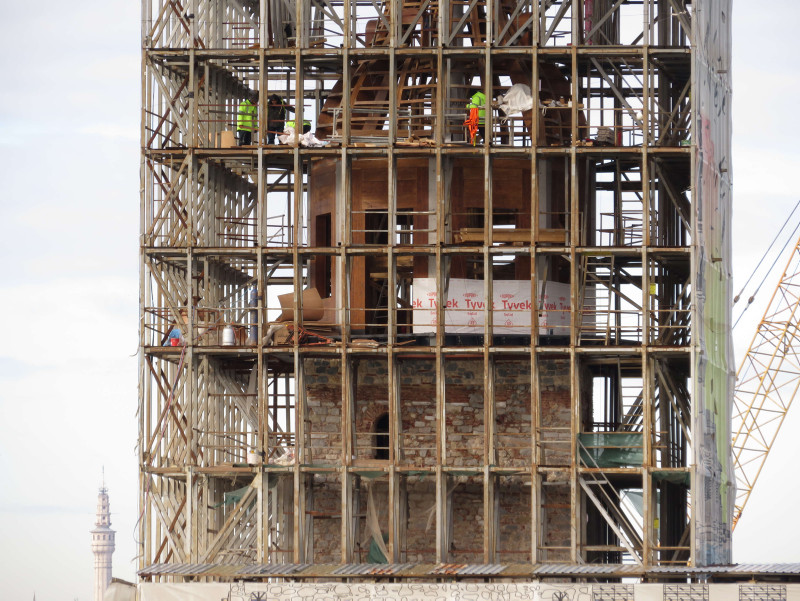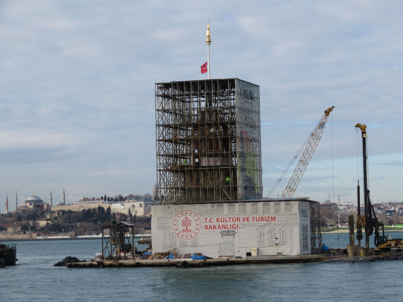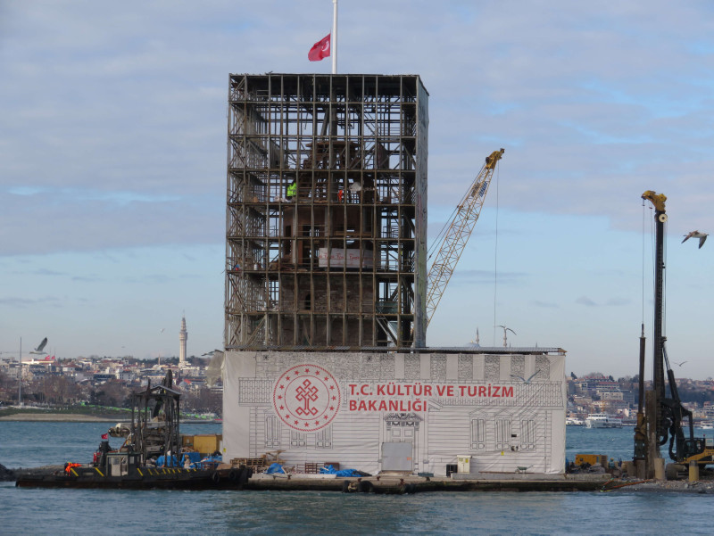 Kulenin külah kısmı özgün malzemeye uygun olarak yenilenmesi çalışmaları sürüyor. Kurulan iskelede restorasyon çalışmaları devam ederken gemilerle de alt yapı için borular getirildiği görüldü.