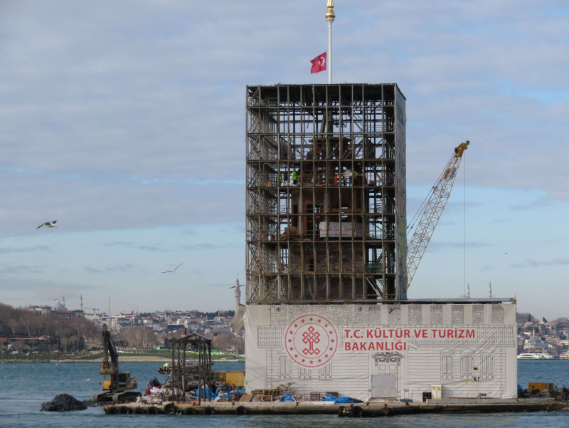 İstanbul'un sembol yapılarından Kız Kulesi'nin süren restorasyon çalışmalarında son durum görüntülendi. Kurulan iskelede çalışmaların sürdüğü görülürken çevresinde de altyapı çalışması için borular getirilmesi dikkat çekti.