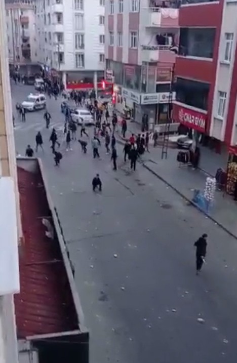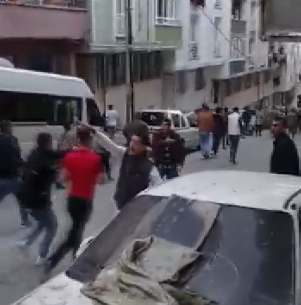 Gruplar birbirlerine satır, sopa ve taşlarla saldırmaya başladı. Çevredeki bir vatandaş kavgayı ayırmak için havaya ateş açtı.