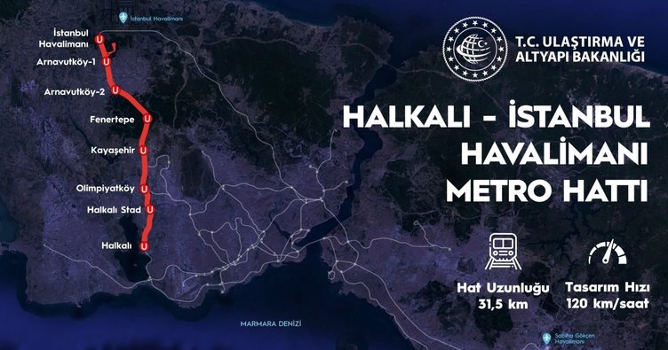Halkalı- İstanbul Havalimanı Metro Hattı 31,5 kilometre uzunluğundadır. Saat 120 km tasarım hızıyla günde 600 bin yolcu bu hattımız ile seyahat edebilecektir.