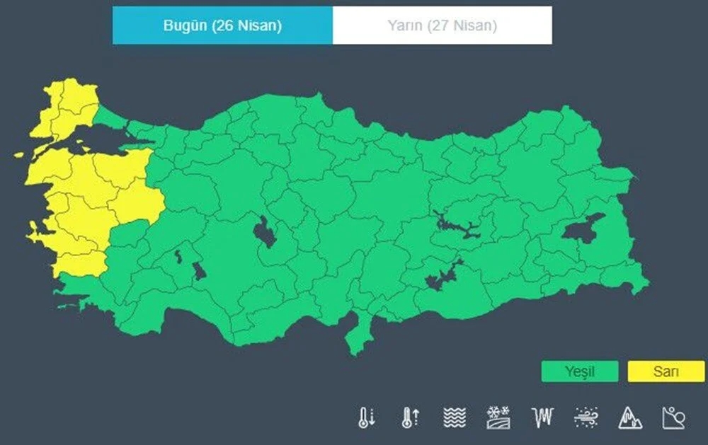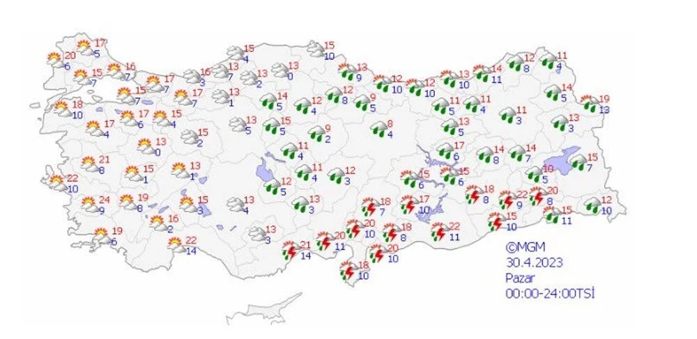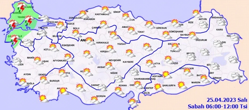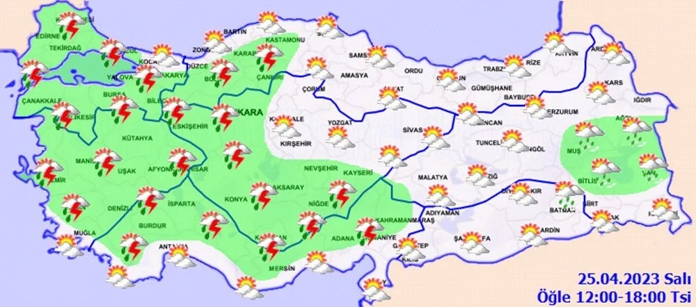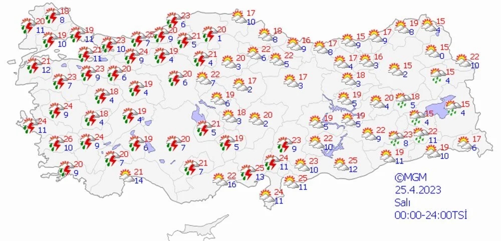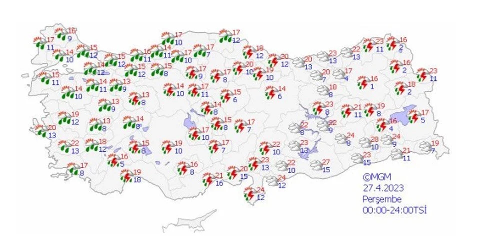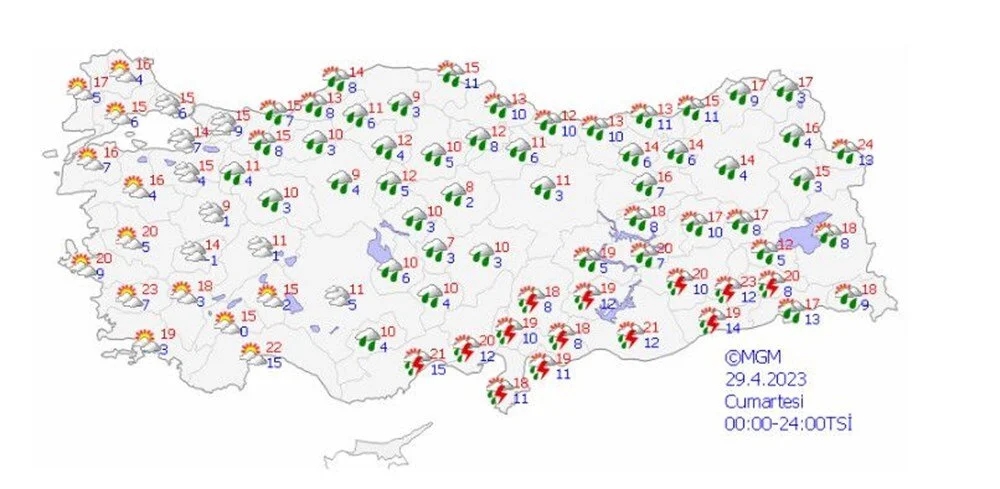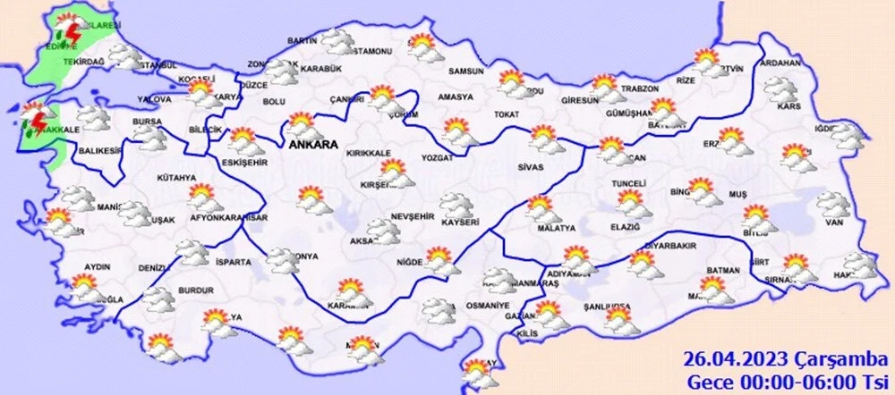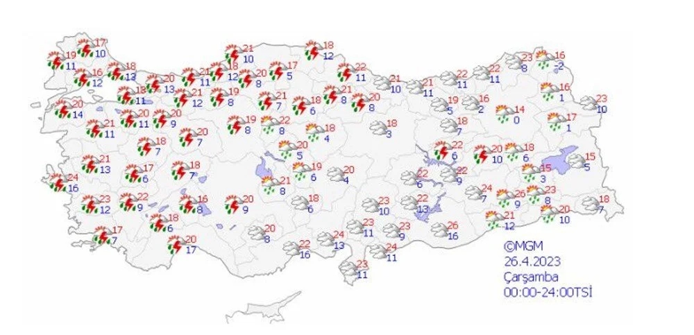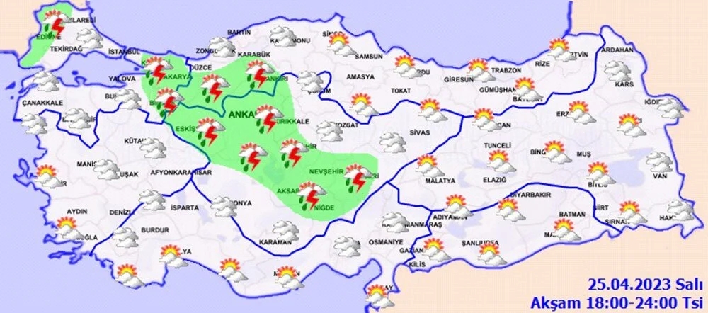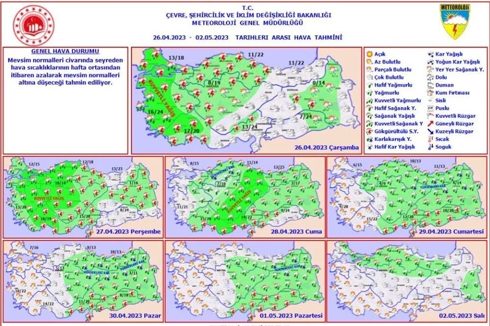 Meteoroloji Genel Müdürlüğü tarafından yapılan son değerlendirmelere göre: Ülkemiz genelinin parçalı ve çok bulutlu, Marmara, Ege, Batı Akdeniz, Doğu Akdeniz'in Toroslar Mevkii, İç Anadolu'nun kuzey ve batısı, Batı ve Orta Karadeniz, Doğu Anadolu'nun kuzeyi ile Bingöl, Muş, Bitlis, Şırnak, Batman, Siirt ve Mardin çevreleri ile Diyarbakır'ın doğu ilçelerinin yerel sağanak ve gök gürültülü sağanak yağışlı geçeceği tahmin ediliyor.
