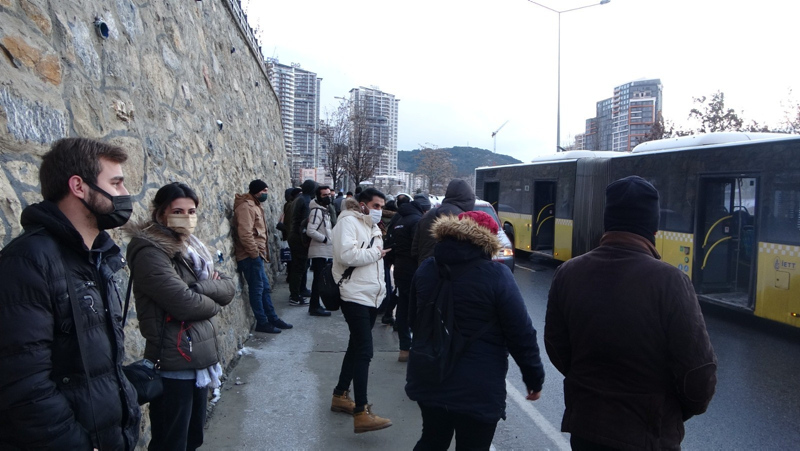 Kartal'da İETT otobüsü arızalanınca yolda kaldı. İETT şoförü ise soğukta yolcuları indirdi. Kar yağışı nedeniyle caddede yoğun olan trafik, otobüsün yolda kalmasıyla adeta felç oldu.