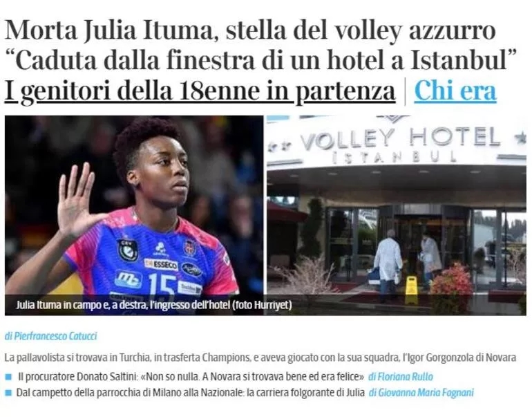 "YENİ EGONU'YDU" İtalyan basınından Corriere Torino haberi 'Ituma'nın ölümü Novara'yı şok etti' başlığıyla duyururken Corriere dello Sport ise 'Voleybolda dram! Julia pencereden atladı ve hayatını kaybetti' başlığını kullandı. La Gazzetta dello Sport: İtalya Genç Milli Takımı'nın yıldızı, İtalyan voleybolunda yeni Egonu'ydu.