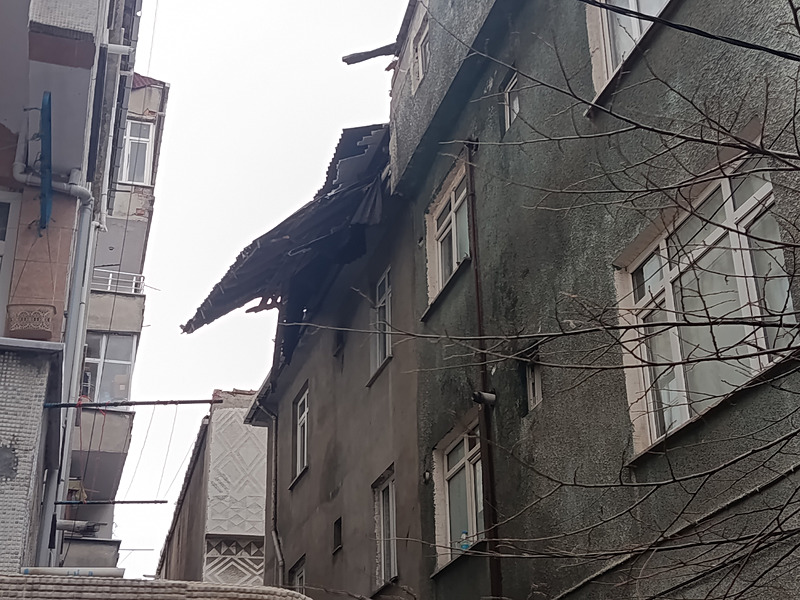 Esenler'de 4 katlı bir binanın çatısı uçtu, park halindeki 2 otomobil hurdaya döndü. Kaldırımda yürüyen bir kadın, parçaların altında kalmaktan son anda kurtuldu.