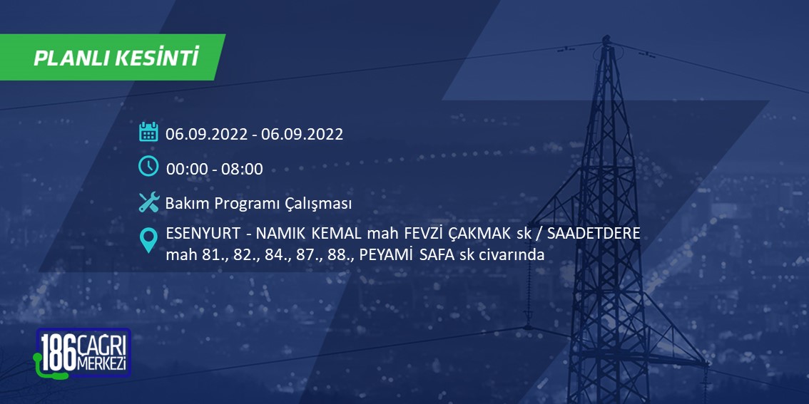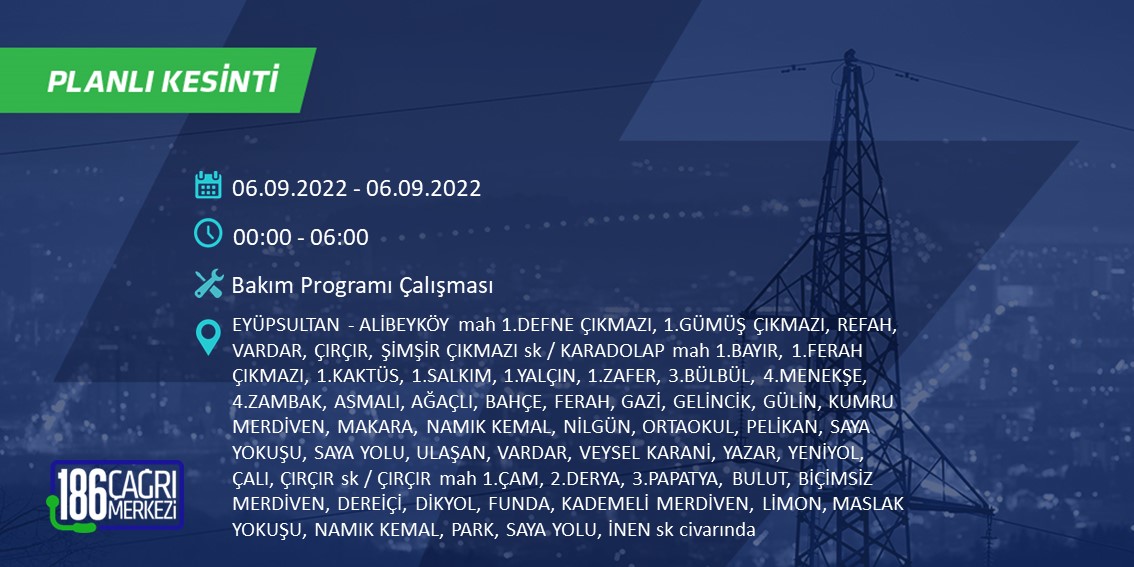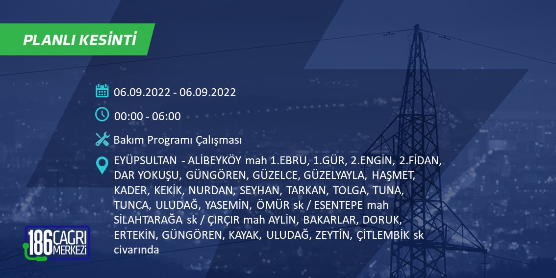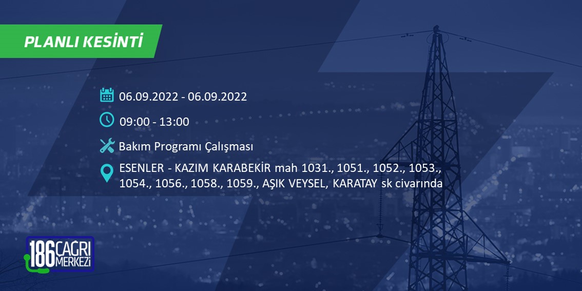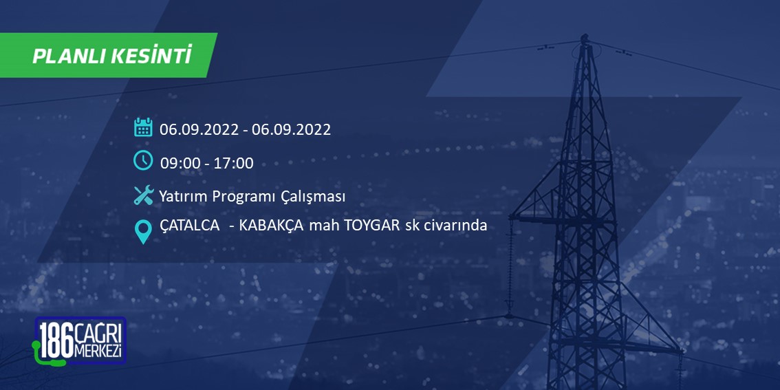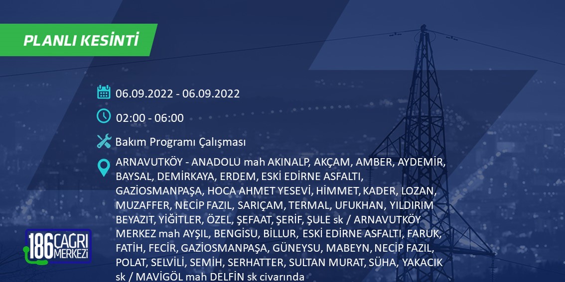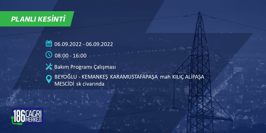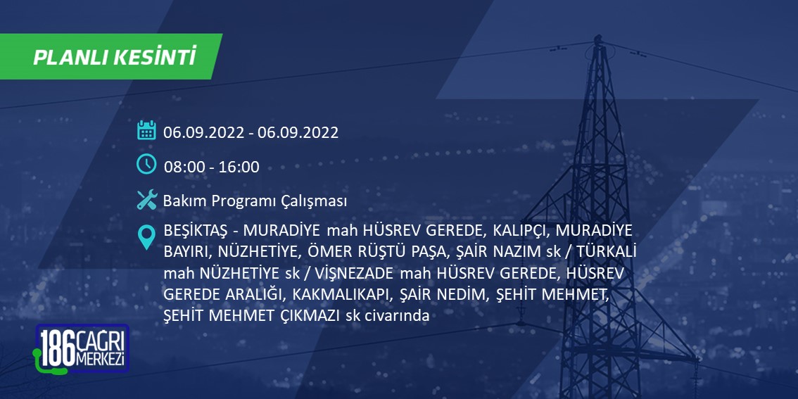 Boğaziçi Elektrik Dağıtım A.Ş tarafından yapılan açıklamaya göre 6 Eylül Salı ve 7 Eylül Çarşamba günü İstanbul'un bazı ilçelerinde çeşitli saatlerde elektrik kesintileri uygulanacak.
