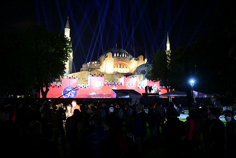 Fatih, daha sonra kilisenin camiye dönüştürülmesini emretti. Ulemadan birisi ezan okudu. Fatih, namaz kıldıktan sonra bu zaferi için dua edip, Allah'a şükretti. Daha sonra Ayasofya'nın kubbesine çıktı ve yanındakiler şehrin harap durumunu seyreden padişahın şu mısraları söylediğini duydular: "İmparatorun sarayında örümcek perdedârlık ediyor, Efrasiyab'ın kulelerinde baykuş nevbet vuruyor".