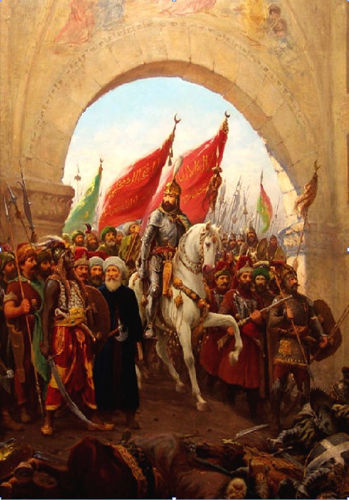 Şehir tam olarak Osmanlılar'ın eline geçince artık Fatih unvanını kazanan İkinci Mehmed yeniçerileri ve vezirleriyle birlikte surlardan içeri girdi. Kafile şehrin sokaklarından geçerek, Ayasofya'ya geldi. Burada atından inen genç hükümdar, yerden aldığı bir avuç toprağı kavuğunun üzerine serpti. Bu hareketi ile Allah'a sığındığını gösteriyordu.