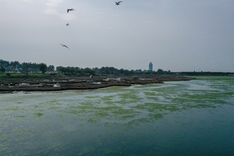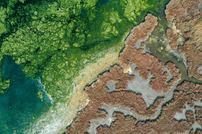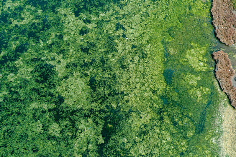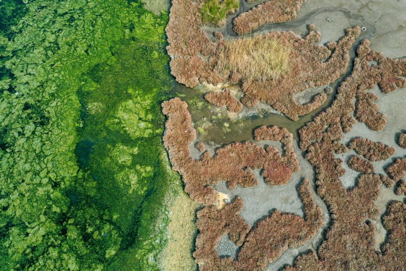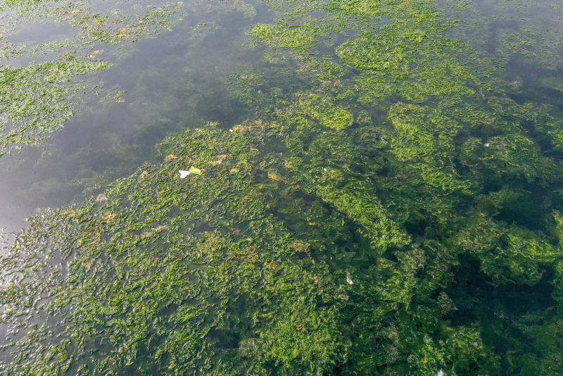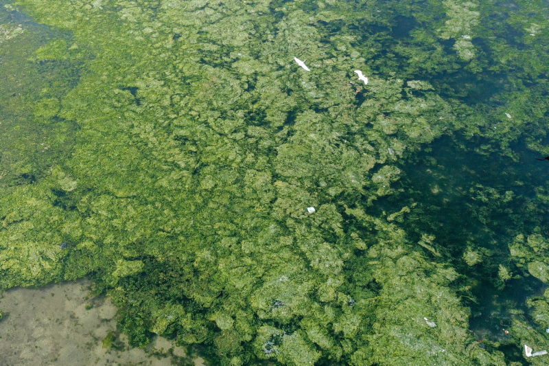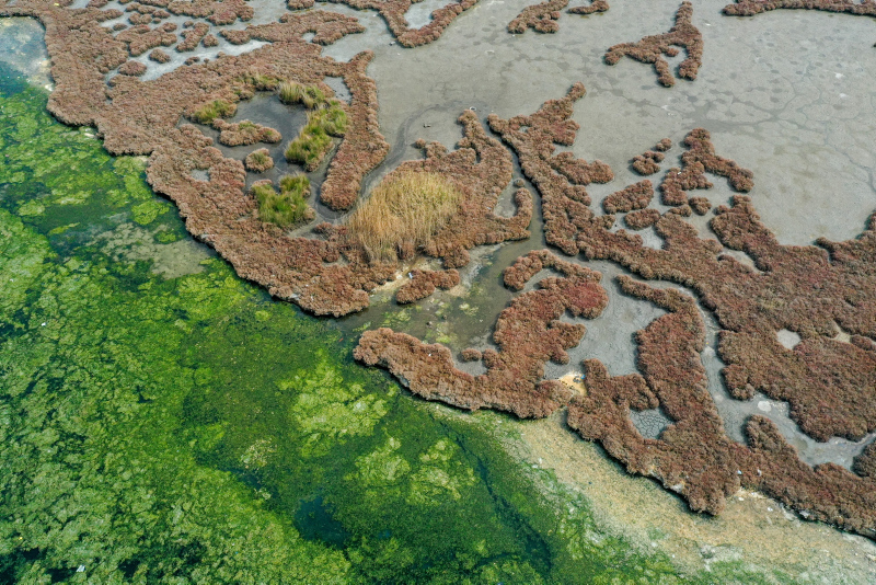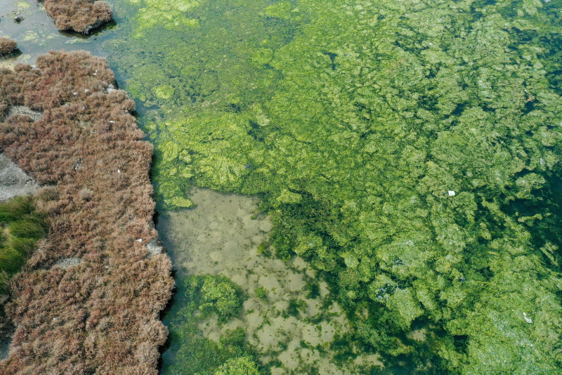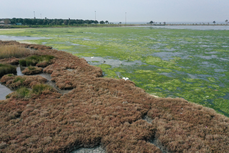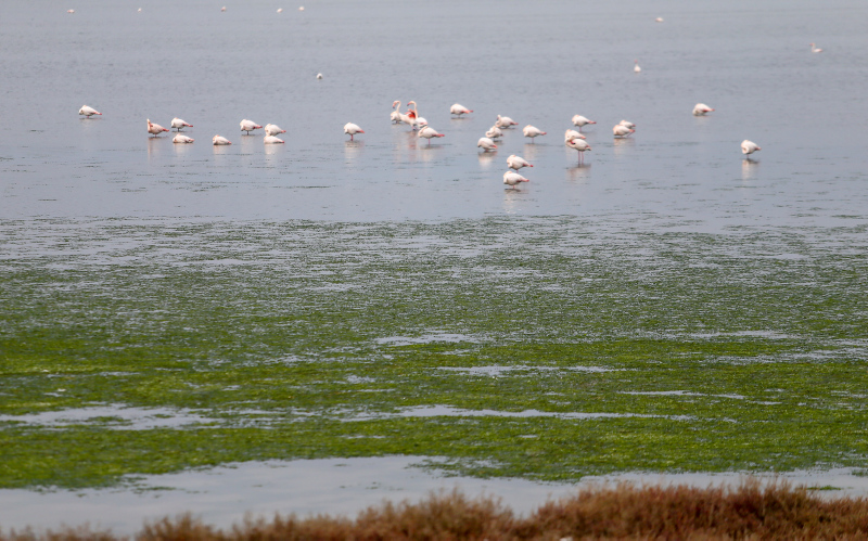 Flamingo başta olmak üzere çok sayıda kuşun yaşadığı lagünde, suyun yüzeyi deniz yosunlarıyla örtüldü.