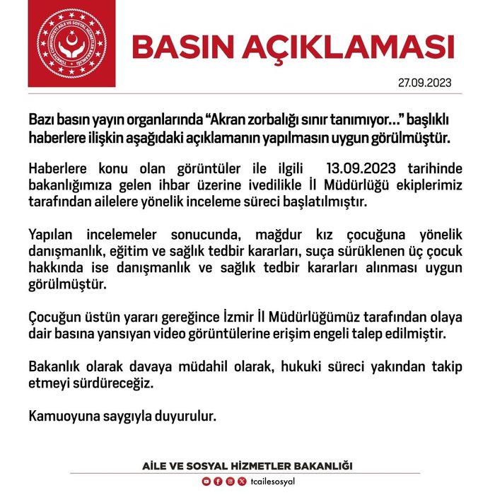 Aile ve Sosyal Hizmetler Bakanlığı'ndan, İzmir'de yaşanan ve bazı basın yayın organlarında yer alan "Akran zorbalığı sınır tanımıyor" başlıklı haberlere ilişkin açıklama yapıldı.