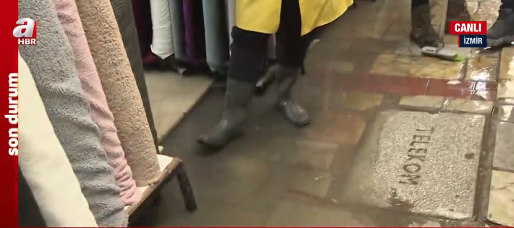 Çok fazla bir yağış yok İzmir'de normal yağış var ama bunda bile görmüş olduğunuz gibi esnaf çizmelerin giymiş dükkanlarını temizliyor.