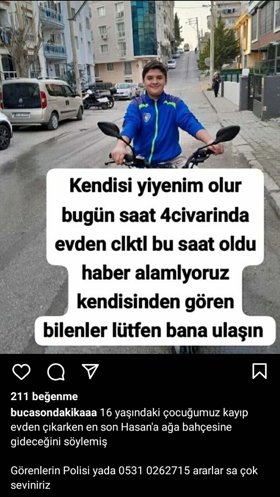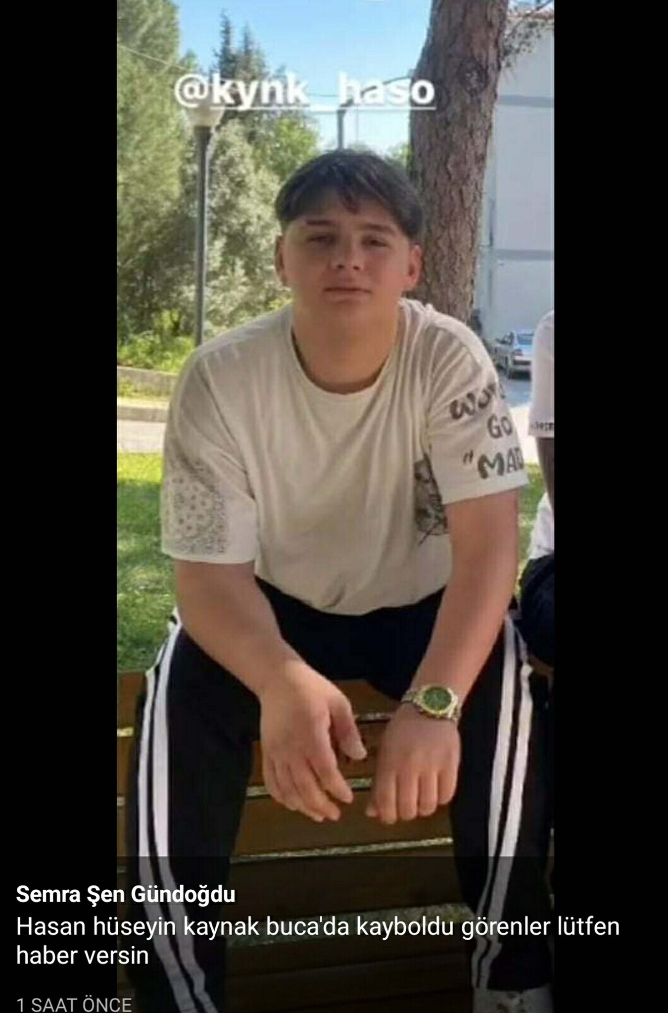 Buca'da denizcilik lisesi öğrencisi olan Hasan Hüseyin Kaynak, dün saat 16.00 sıralarında, yakınlarına Hasanağa Bahçesi'ne gideceğini söyleyerek Adatepe Mahallesi'ndeki evlerinden çıktı