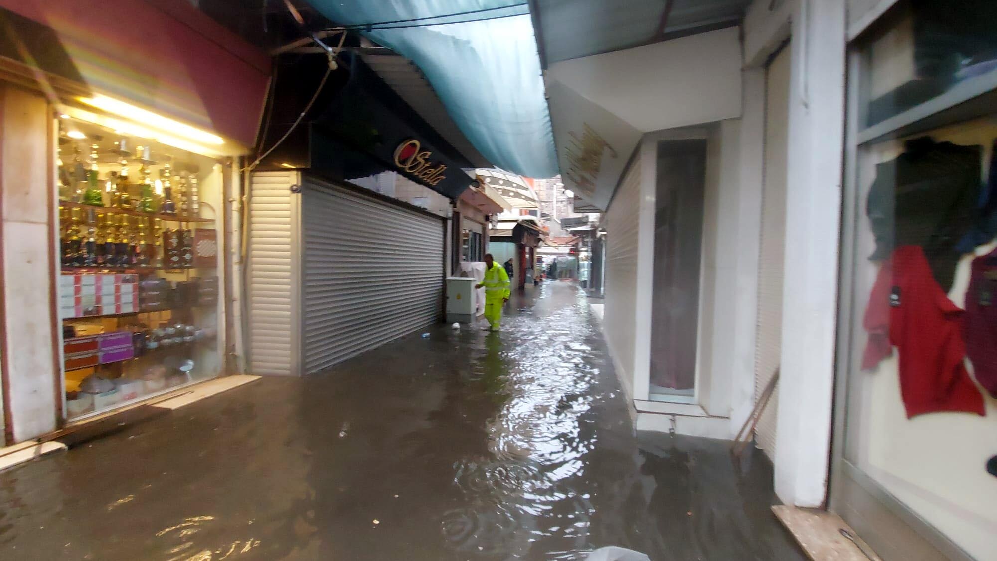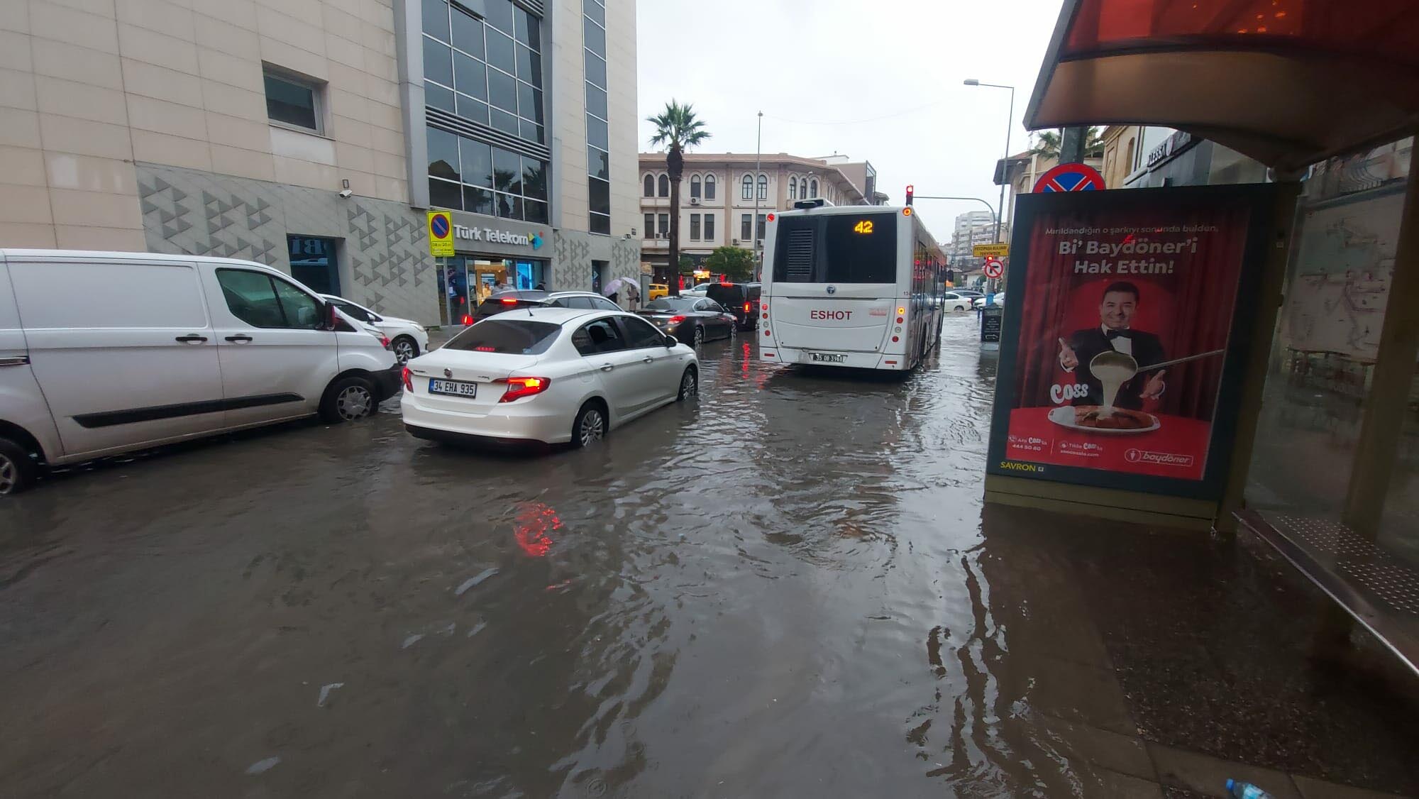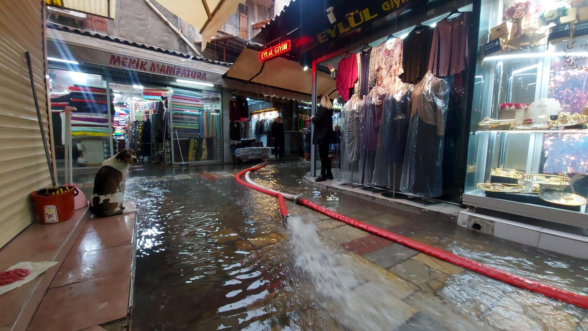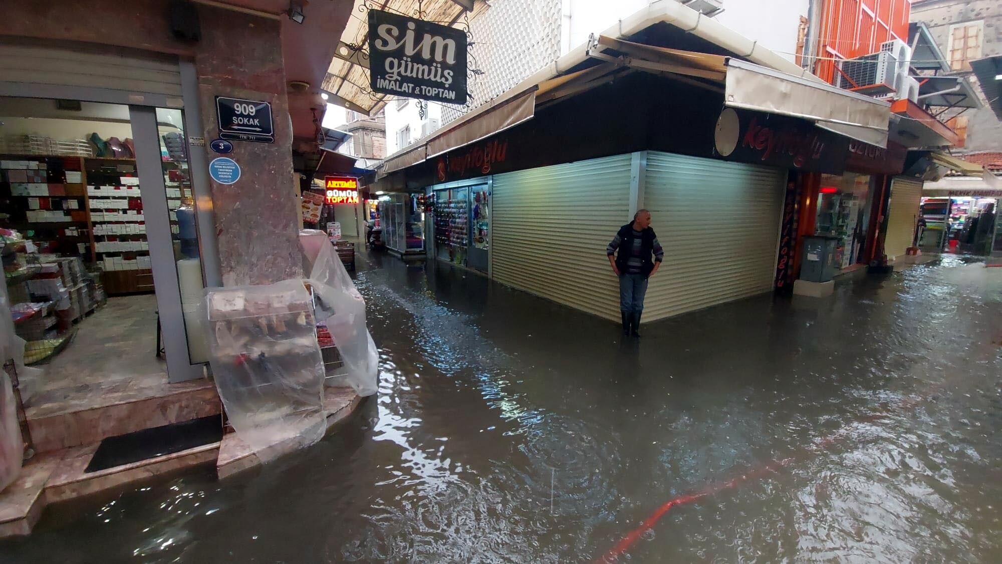 Sağanakta, önceki gün su baskınlarının yaşandığı Tarihi Kemeraltı Çarşısı ise yine sular içinde kaldı. Küçük Demirhan İşhanı'ndaki çok sayıda iş yerini de su bastı.