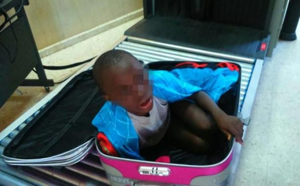 Polisin açıklamasına göre Abou adındaki çocuk, 19 yaşındaki bir kadın tarafından bavul içinde taşınırken bulundu...
